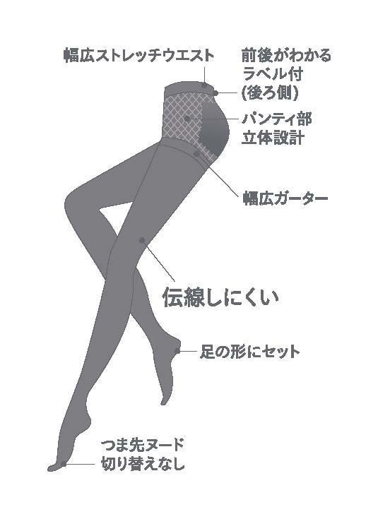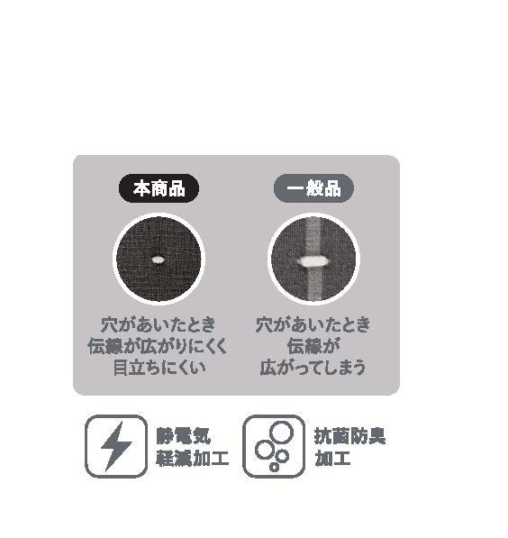 穴が開いても伝線しにくい設計で耐久性を確保。静電気軽減加工で快適さを高め、抗菌防臭加工で清潔感もキープします。