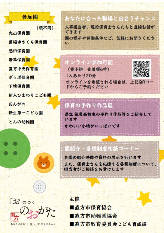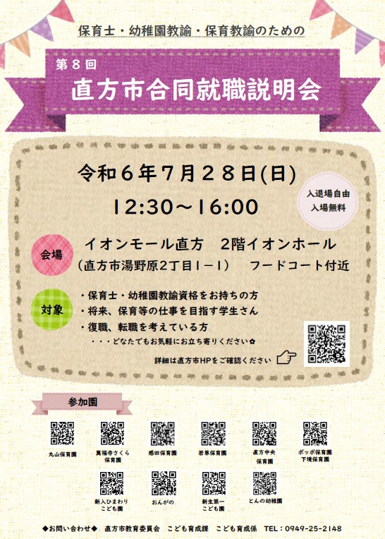 「直方市保育士・幼稚園教諭・保育教諭のための合同就職説明会」を開催します