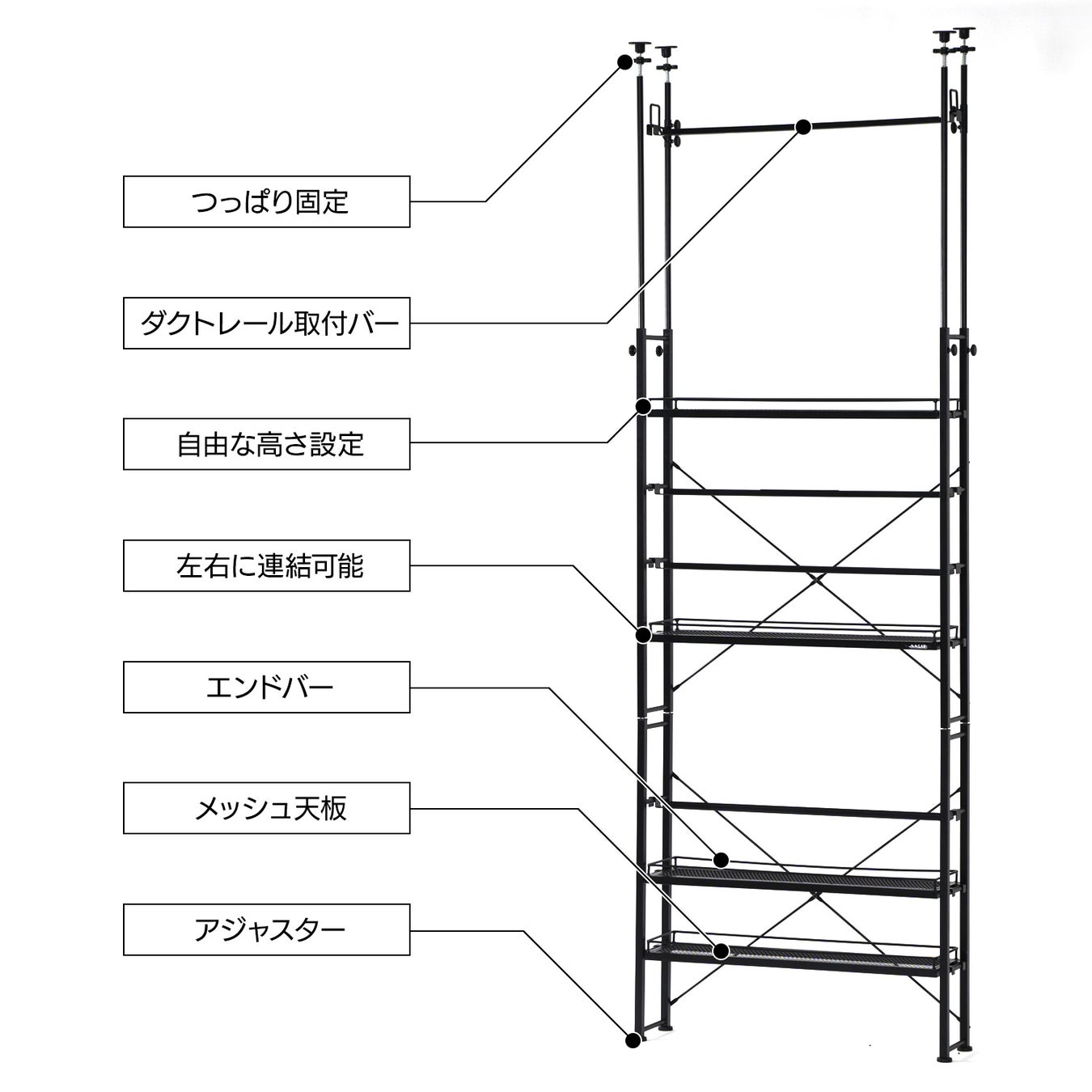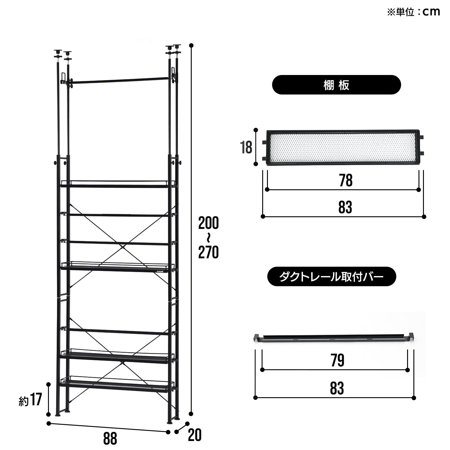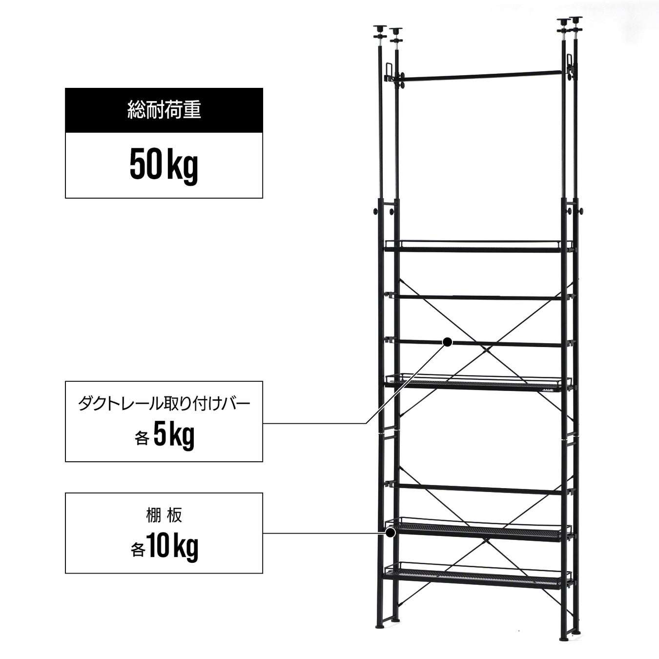 【耐荷重】総耐荷重:50kg、ダクトレール取付バー:各5kg、メッシュ棚板:各10kg
