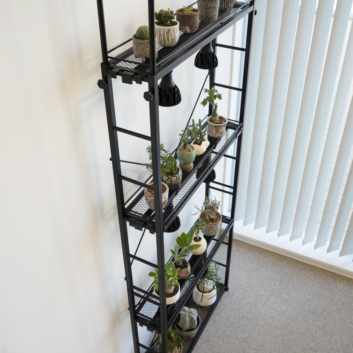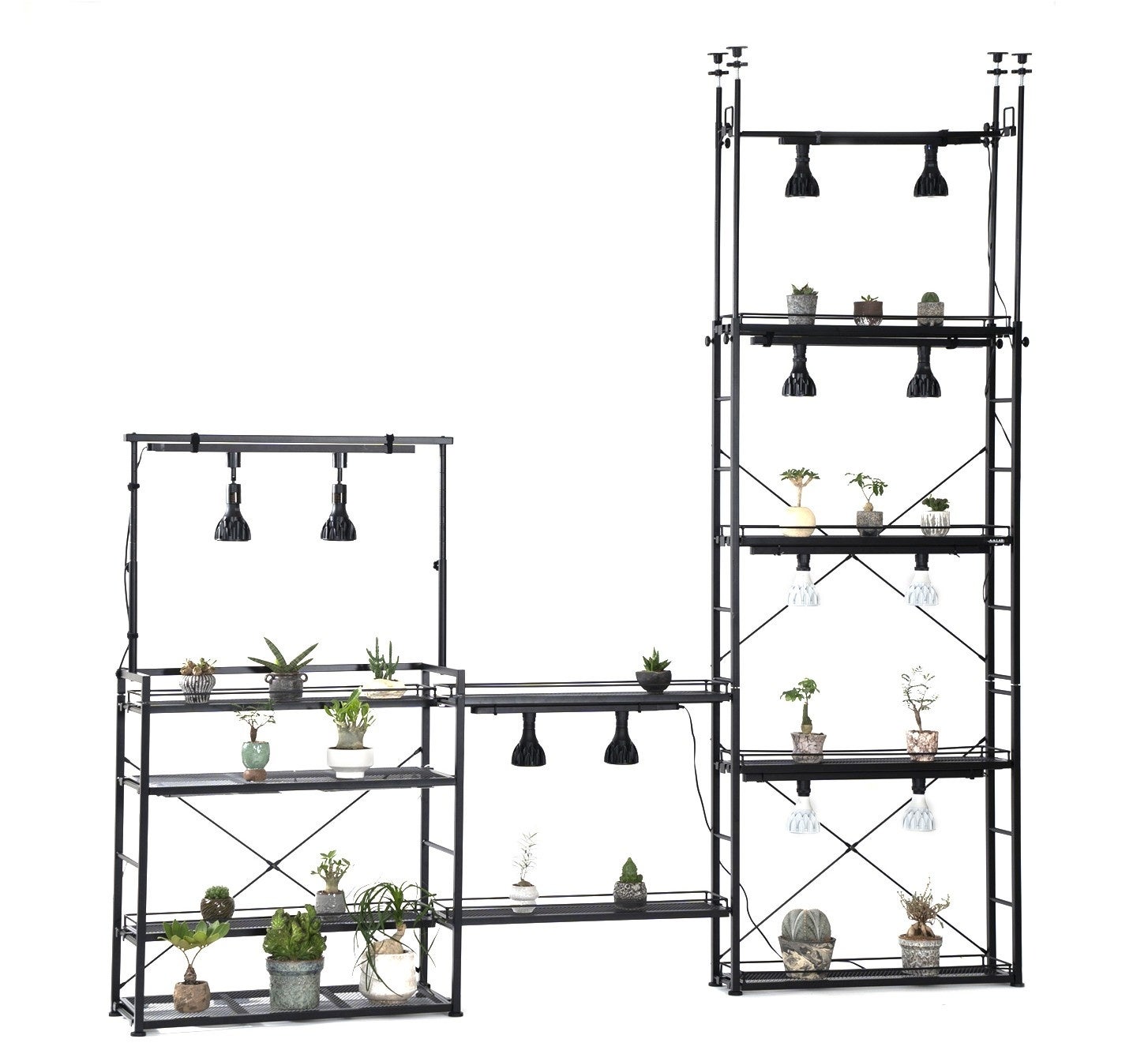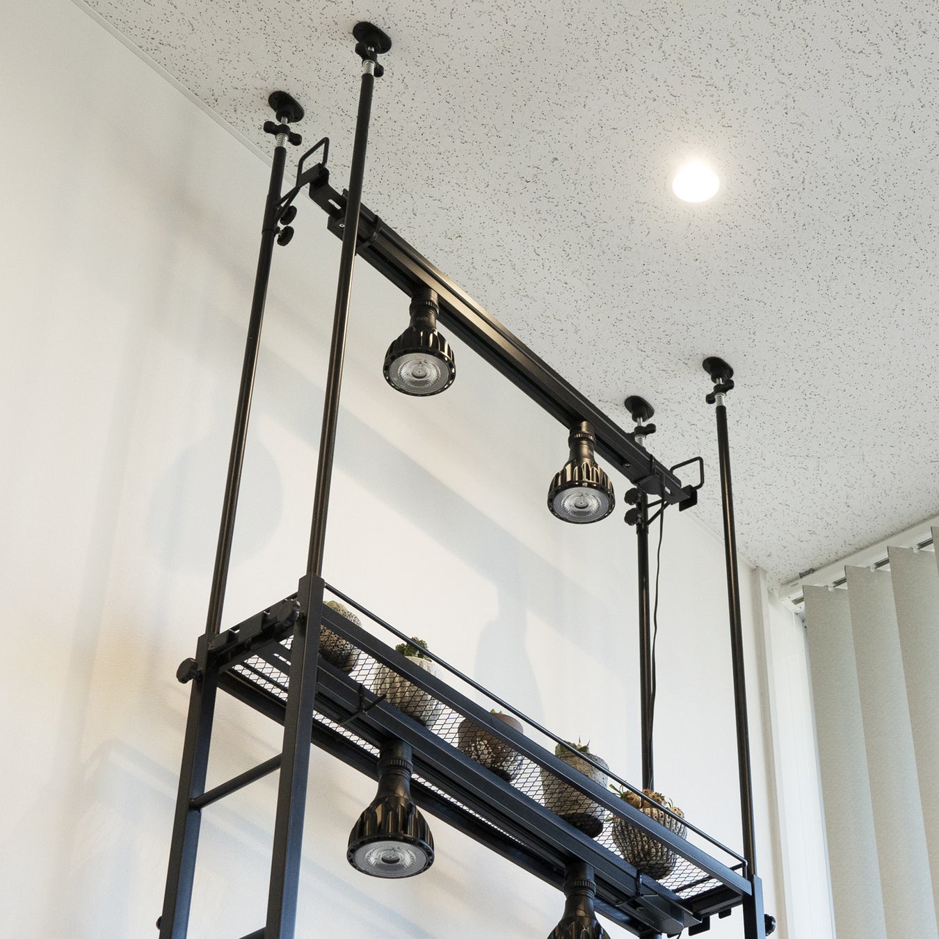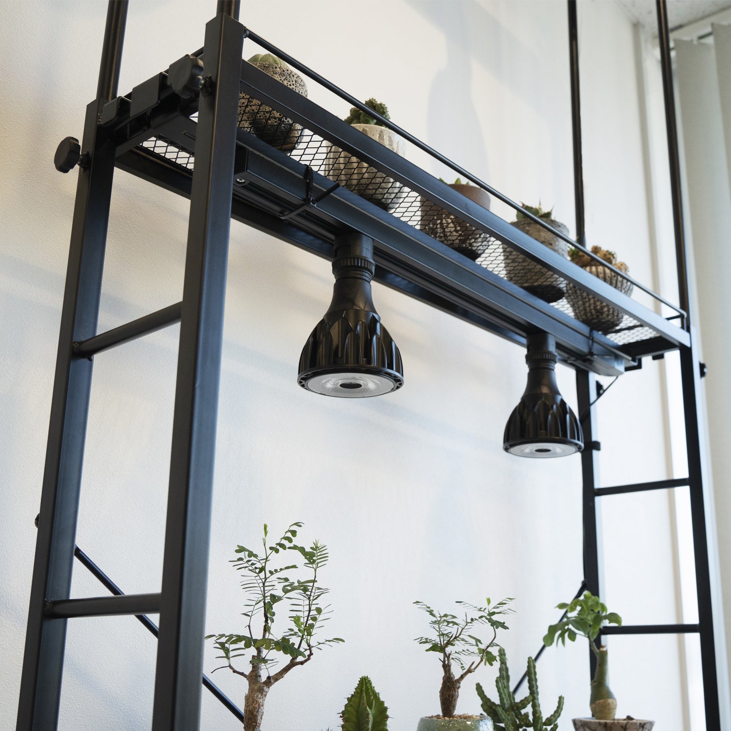 ビザールプランツの室内育成に特化した仕様で、誰でも簡単に最適な育成環境を構築することができます。市販のダクトレールを結束バンドなどで固定可能な独自設計のバー(ダクトレール取付バー)が付属し、育成ライトやサーキュレーターの設置をスマートに実現。棚板にはスチールメッシュ素材を採用し、空気が循環しやすいよう配慮しています。鉢底が蒸れにくく、ライトの光が下段まで届きやすい構造で、日照不足や鉢底の蒸れ(根腐れ)などによる枯死リスクを低減。バーや棚板の高さは、植物の成長度合いやサイズ・鉢数に応じて調節でき、別売りのオプションパーツを用いれば、さらにレイアウトの幅が広がります。大掛かりなDIYをせずとも、展示・育成どちらも叶う理想の植物棚を自分好みに構築することが可能です。
