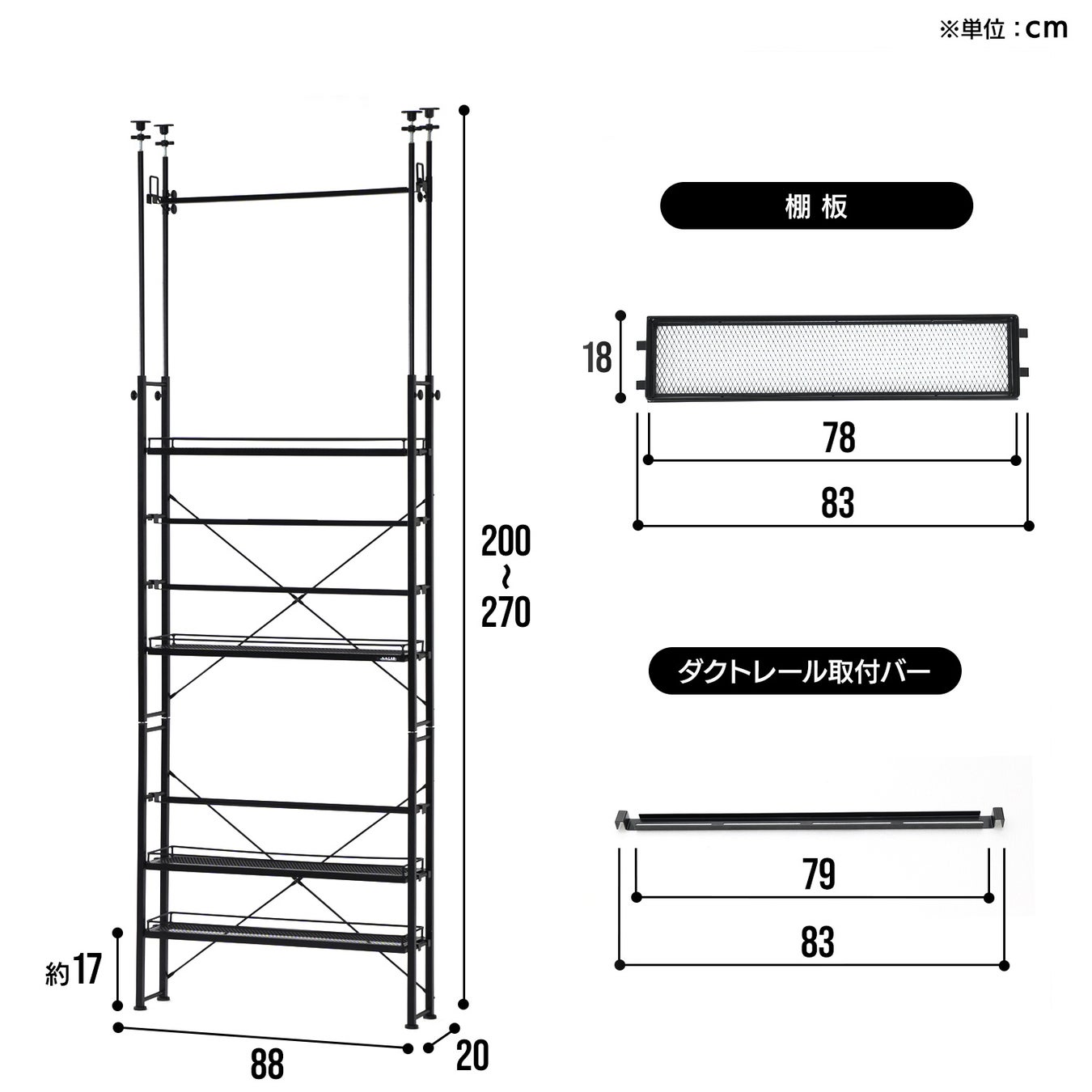 【サイズ】幅88×奥行き20×高さ200~270cm