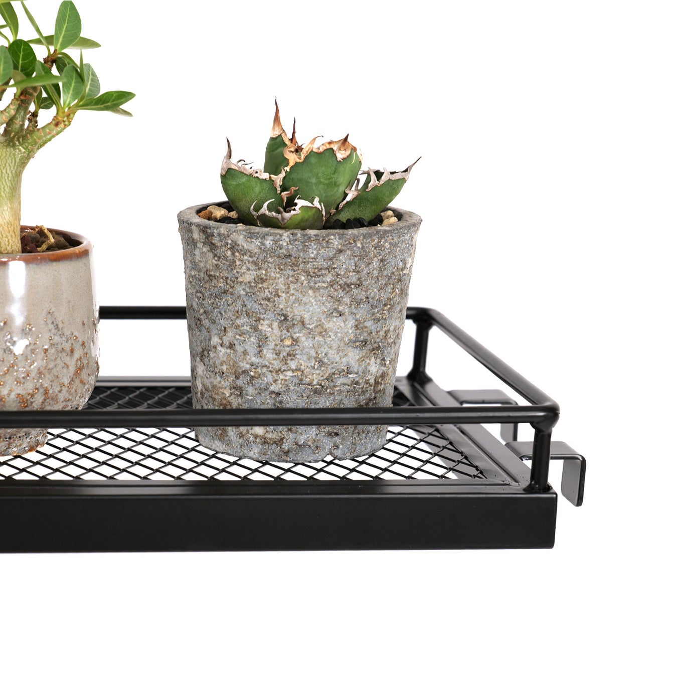 メッシュスチール製で通気性もバッチリ。植木鉢の落下を防止するエンドバーも搭載しています。