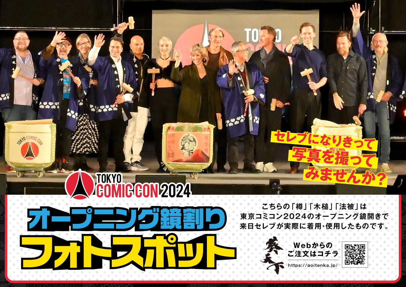 東京コミコン2024のオープニング鏡開きで来日セレブが実際に着用・使用する「酒樽」「木槌」「法被」をブースに展示!それらと一緒に写真撮影してセレブになりきりができるかも!?