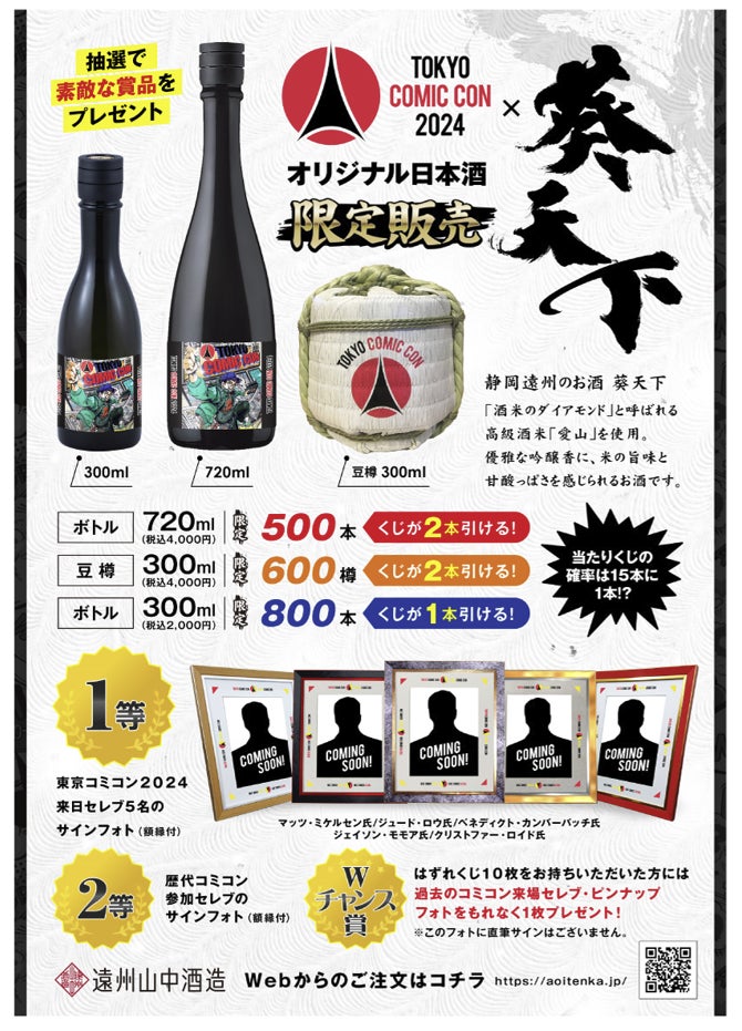 遠州山中酒造株式会社(静岡県掛川市、代表取締役:山中久典)は、コミコンオリジナル日本酒販売やセレブの直筆サインフォトが当たる抽選会など、来場者が楽しめる企画をたくさんご用意!