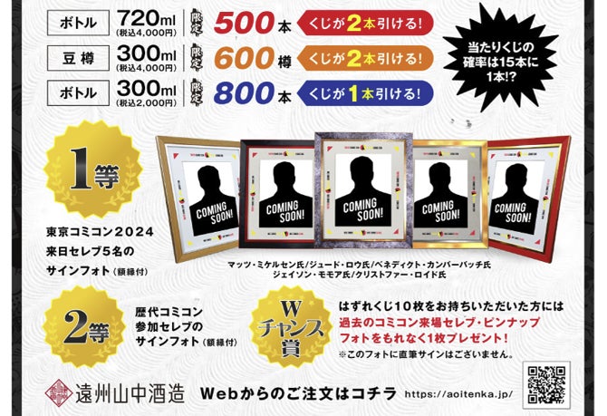 コミコンオリジナル日本酒を購入していただいた方には、東京コミコン2024来日セレブまたは歴代コミコン参加セレブの額縁付直筆サインフォトなどが当たる抽選会をお渡しいたします。