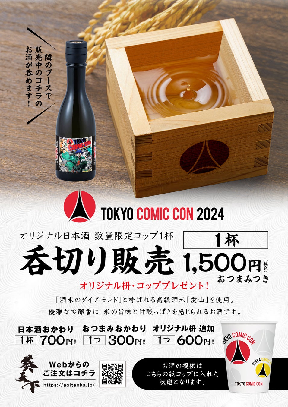 おつまみ・コミコンオリジナル枡・コップがついて、1杯1500円で販売!
