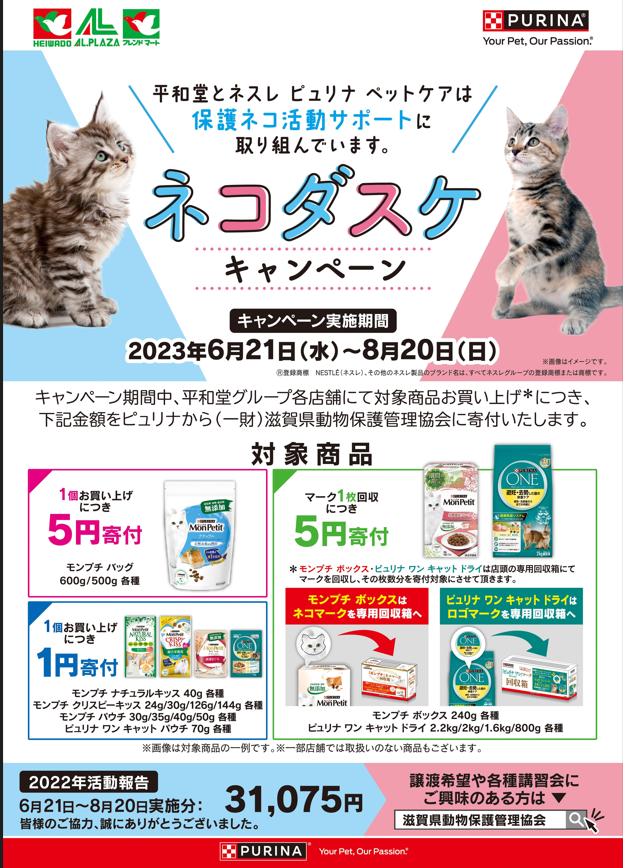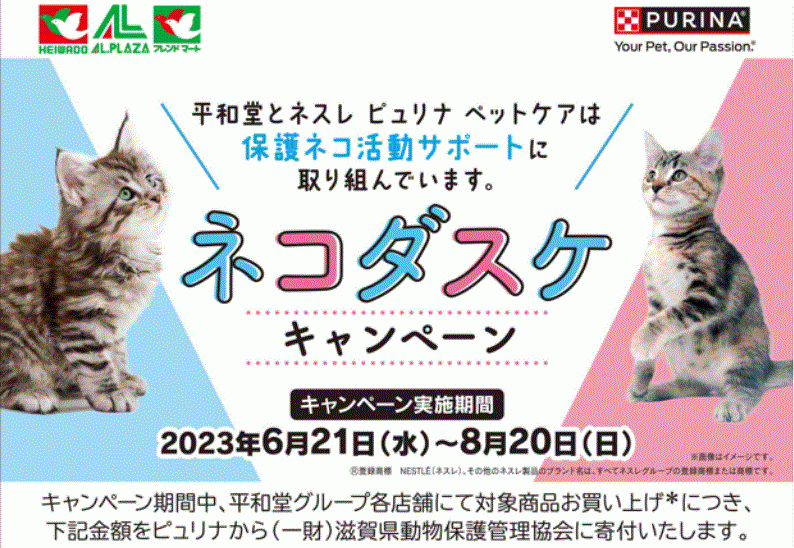 【平和堂&ネスレ ピュリナ ペットケア】ネコダスケキャンペーン~期間中の対象商品のお買い上げ金額に応じて動物保護管理団体へ寄付されます~