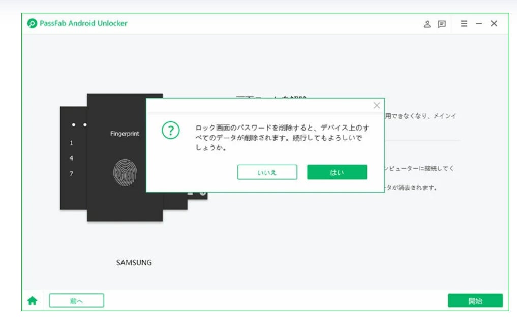 Step3: 「ロック画面のパスワードを削除すると、デバイス上のすべてのデータが削除されます。続行してもよろしいでしょうか。」というメッセージが表示される。ここで「はい」を選択。