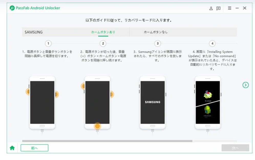 まず紹介するのは専門ソフトを利用する方法です。PassFab Android Unlockはワンクリックで Android パターン、PIN、指紋、パスワードのロックを解除できる専門ソフトです。PassFab Android Unlockを使えばとても簡単に画面ロックを解除し、再度ロックを設定するところまで進めることができます。各ステップがパソコン上で画像とともに説明されるため、初心者にもわかりやすく、動作に迷うことがありません。急いで画面ロックを解除し作業をしたいという方は、こちらの方法が最も有効です。操作は5つのステップは以下の通りです。