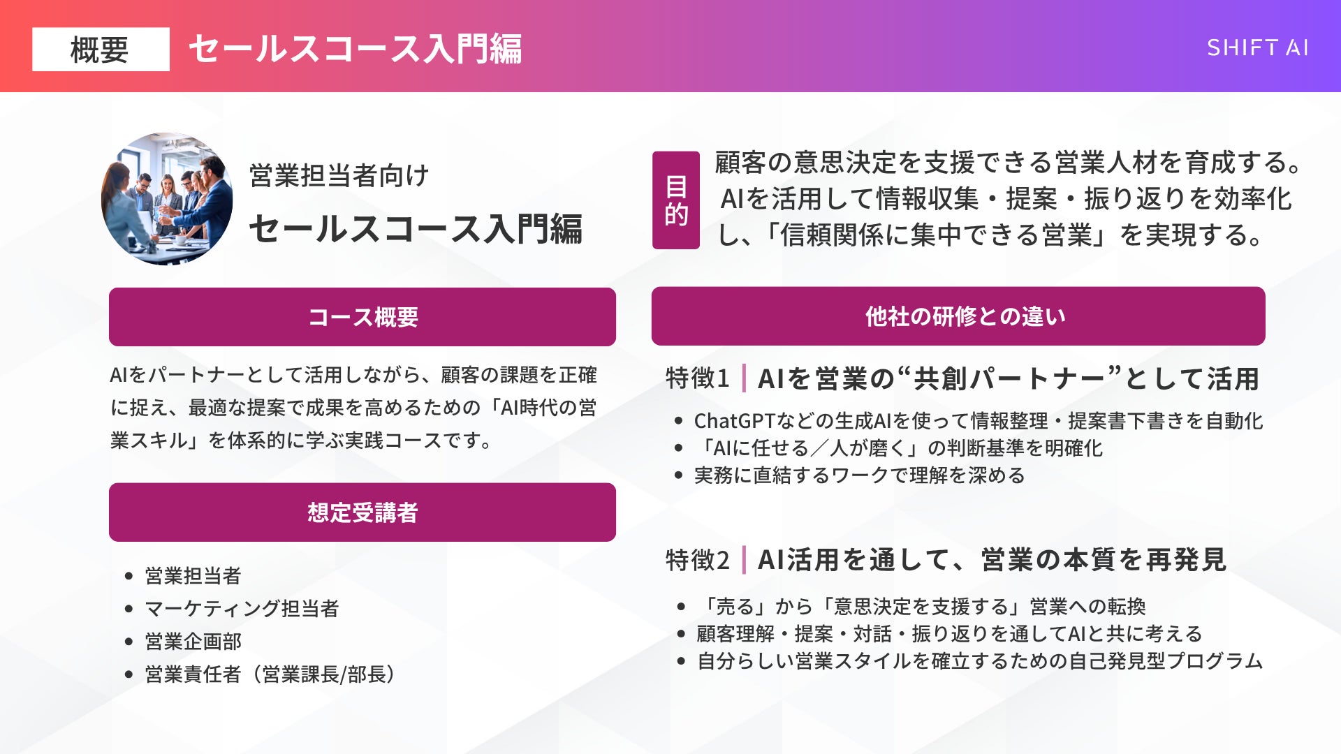 「日本をAI先進国に」を掲げAIのビジネス活用を学べる利用者数No.1※のAI大学「SHIFT AI」を運営する株式会社SHIFT AI(東京都渋谷区、代表取締役 木内翔大、以下 当社 )は、法人向けリスキリング支援サービス「SHIFT AI for Biz」において、2025年2月に提供開始した「セールスコース初級編」をアップデートし、「セールスコース入門編」を2025年11月6日より配信開始します。営業の基本的な型や顧客理解の方法に加え、生成AIを活用した情報収集・商談準備・提案構築など、AIと共に成長していく営業パーソンに必要な新しい基礎力を体系的に学習する内容となっています。