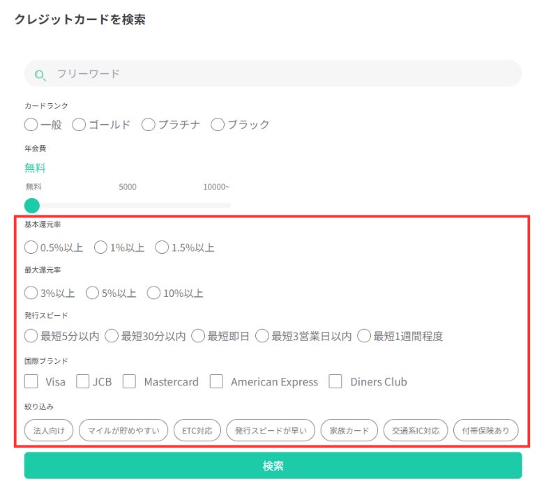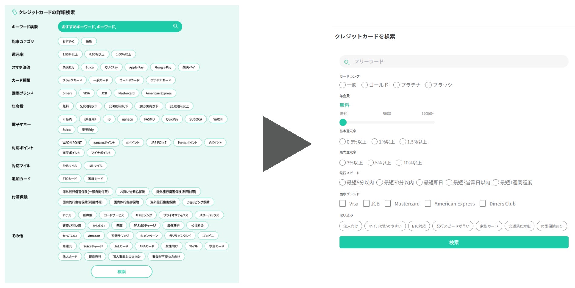 「クレジットカードカテゴリー」のトップページに表示される検索機能を改修しました。リニューアル内容は以下の通りです。