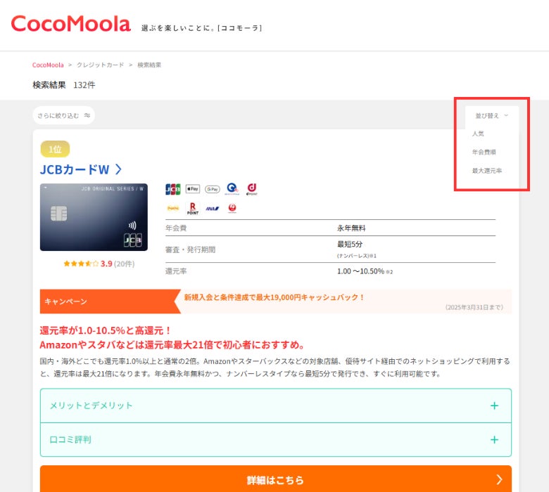 一覧で表示された検索結果を「人気順」「年会費順」「最大還元率順」に並び替えが可能です。より短時間で目的のクレジットカードにアクセスできます。