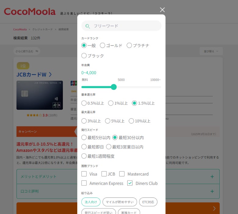 一覧で表示された検索結果に対して、さらなる検索範囲の絞り込みが可能です。検索範囲をより限定することで、条件に合ったクレジットカードを探しやすくなりました。
