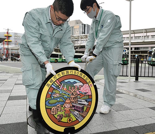 高槻市は、市制施行80周年などを記念してマンホールふたのデザインコンクールを行い、受賞作品5点のデザインを採用したマンホールふたを制作。本日JR高槻駅北駅前広場に設置しました。