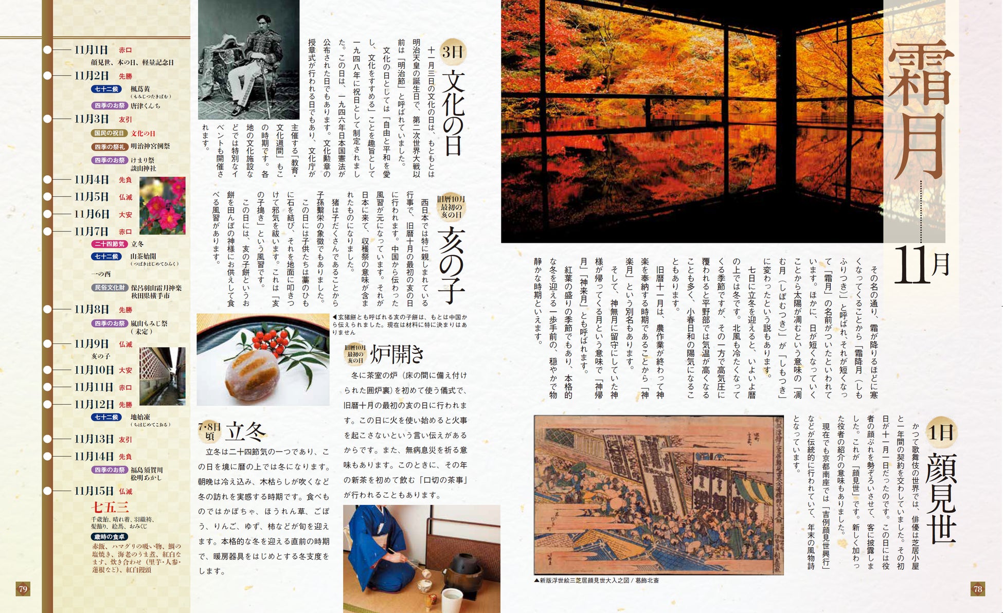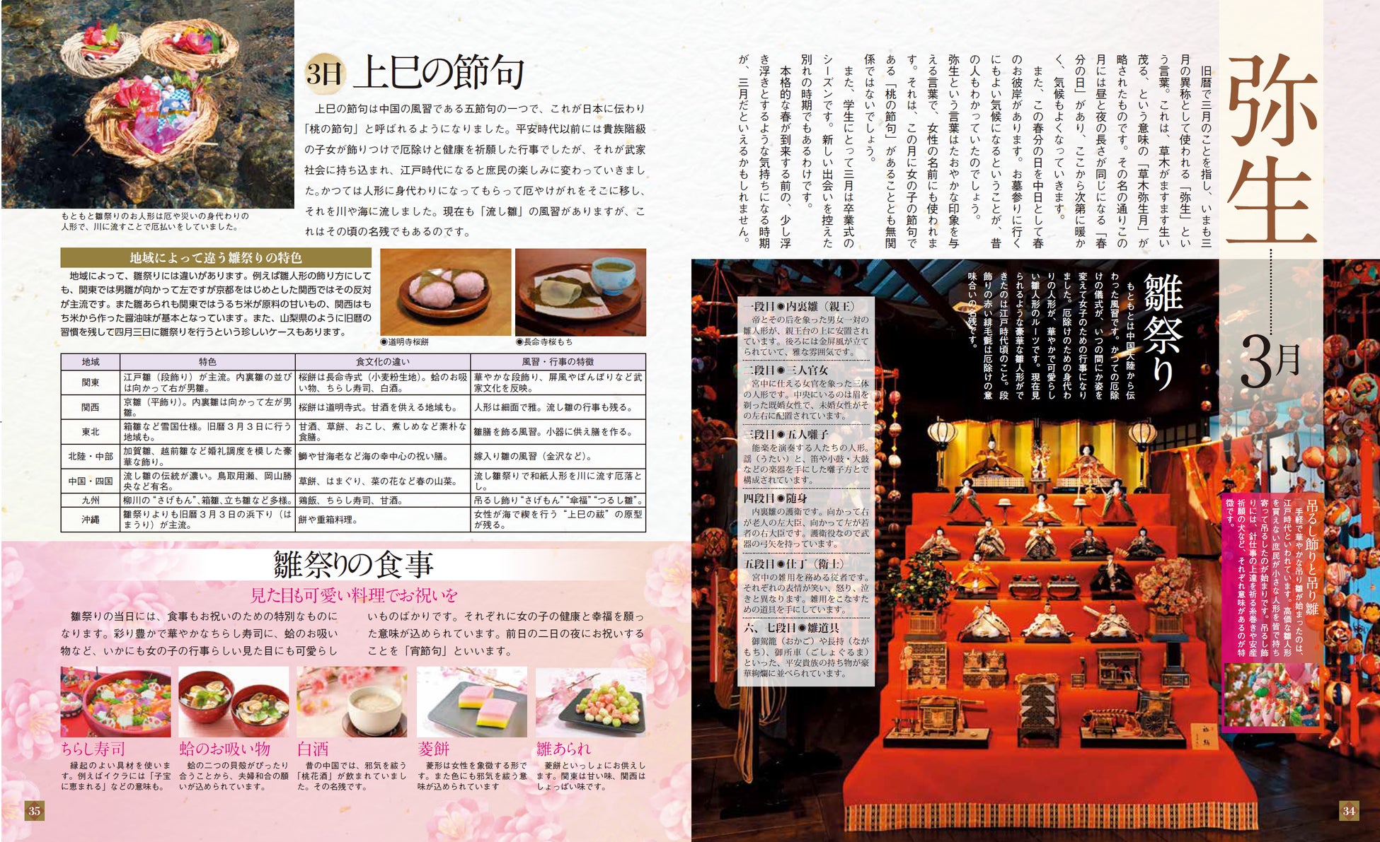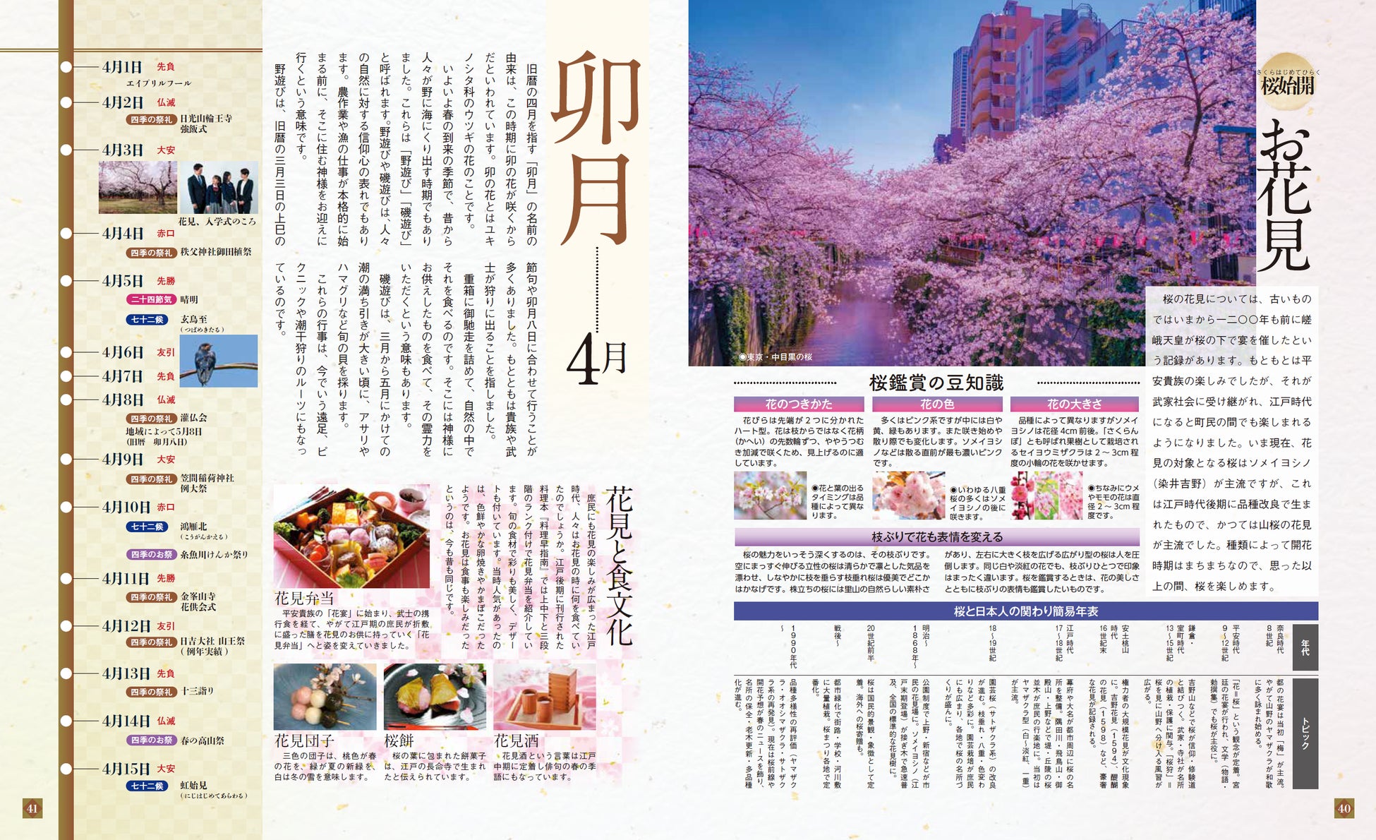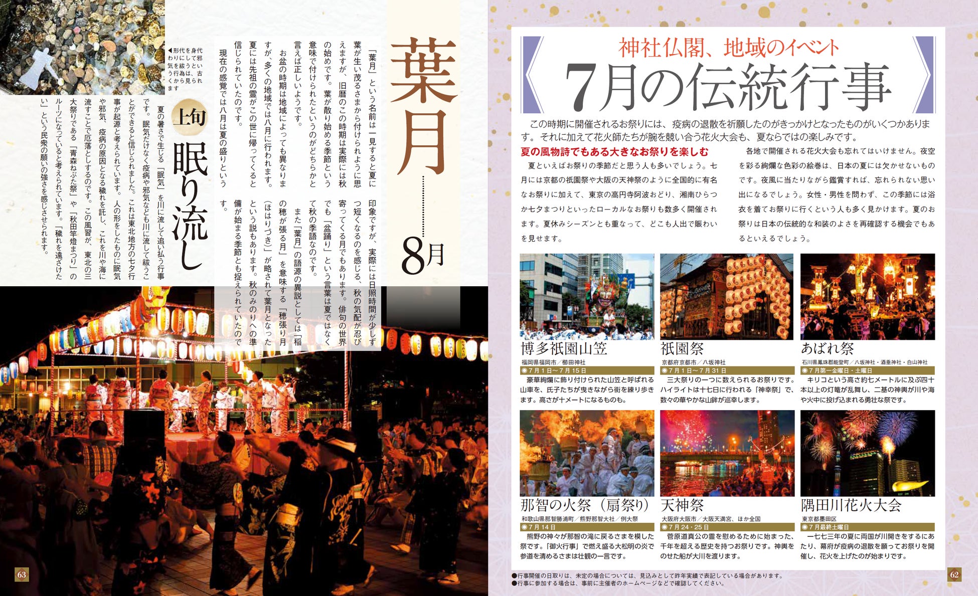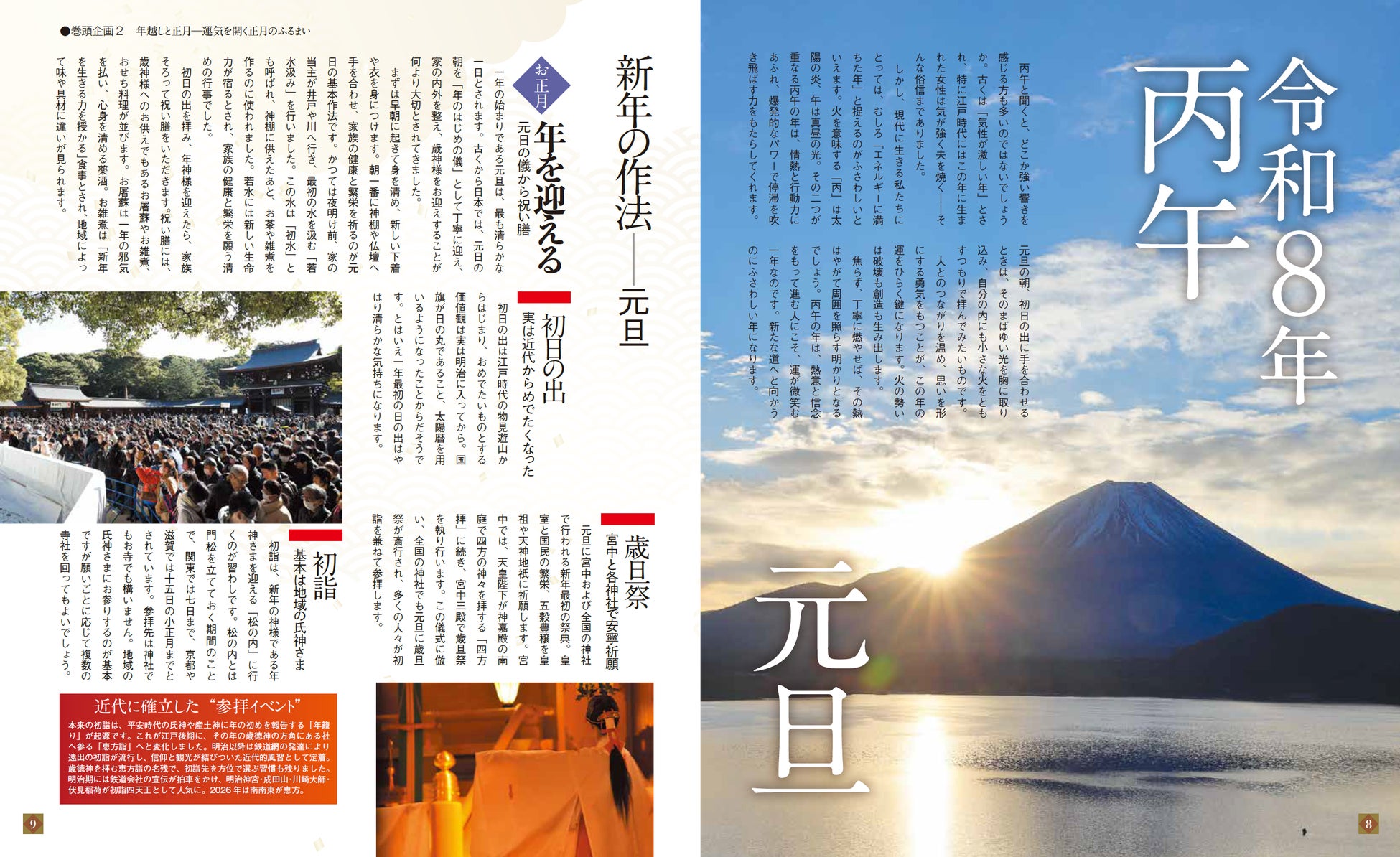 メインは日本の歳時記です。令和8年の暮らしの作法、催事、祭りなどを網羅。旧暦から新暦に直し、365日の日々の機微を記してあります。生活指南としても便利です。特に、祭りや儀礼ごと、花の見ごろ、イベントなどに焦点を当てていますので、本誌のテーマである「ハレとケ」の流れがよくわかります。
