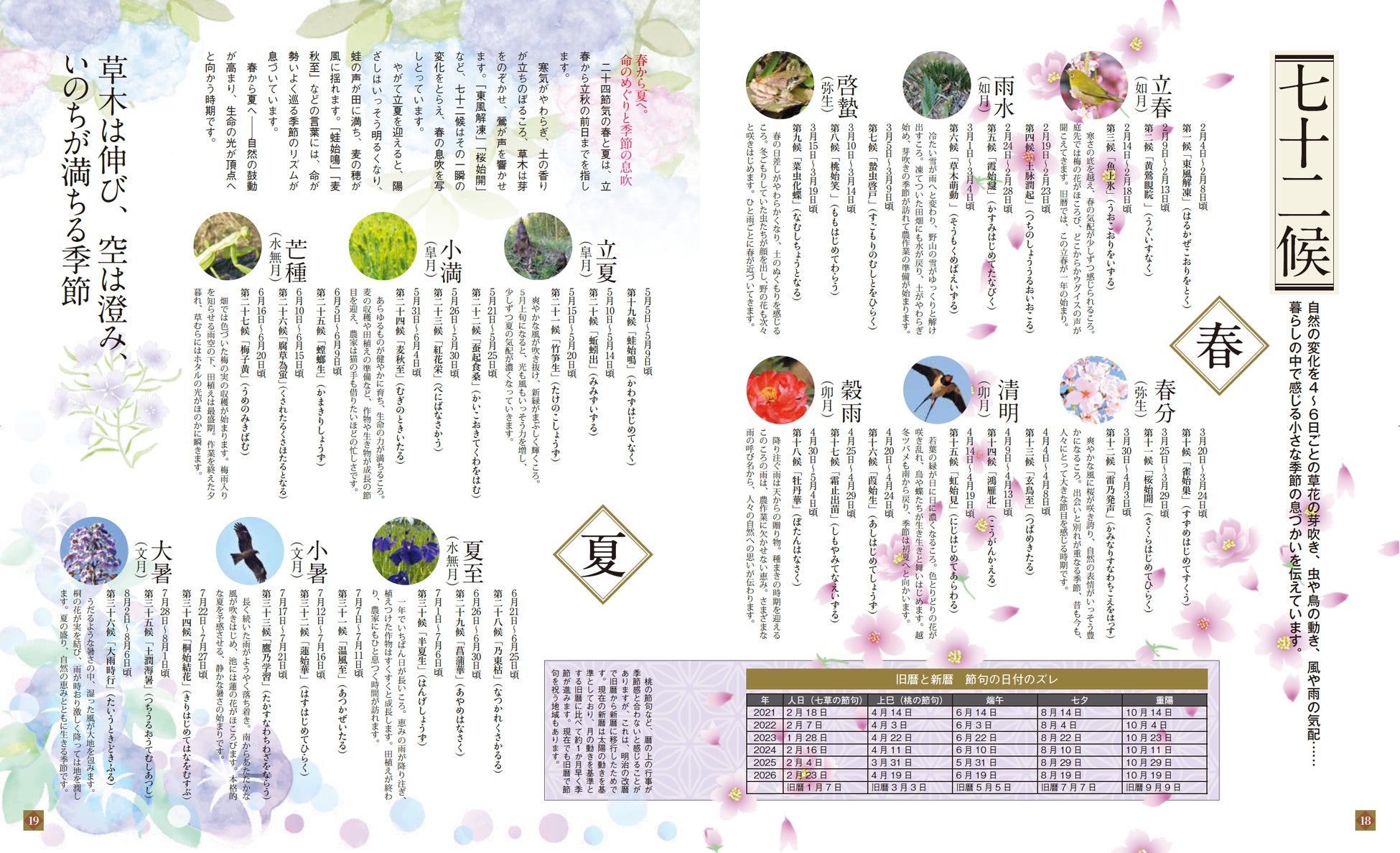 二十四節気と七十二候を解説。1年の自然の事象の動きをわかりやすく解説。春夏秋冬、七十二の動植物や暮らしの機微がわかります。