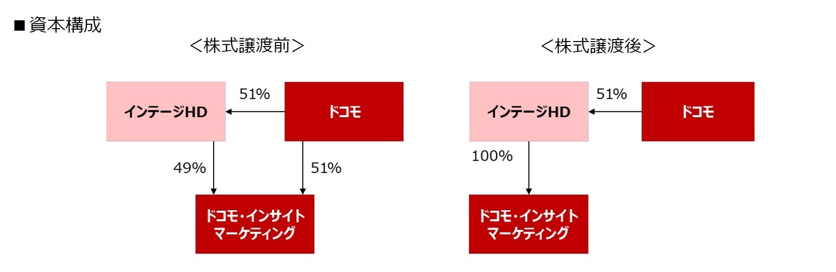 本譲渡契約は、本譲渡契約実行日(2024年7月1日(月曜)(予定))に、ドコモ・インサイトマーケティングによる自己株式取得を行った上で、ドコモが保有するドコモ・インサイトマーケティングの株式全てをインテージHDに譲渡するもので、これにより、ドコモ・インサイトマーケティングはインテージHDの完全子会社となる予定です。