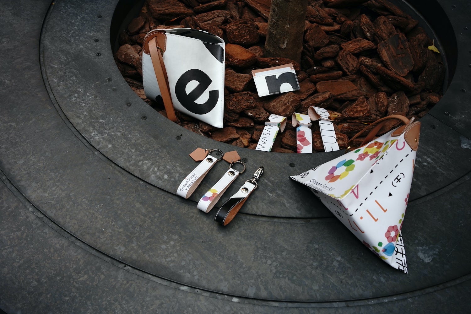 川崎市市制100周年を記念して、市内の駅や公共施設に掲出した広告素材(横断幕など)をアップサイクルしたバッグ、アクセサリーなどを販売。切り出した場所により、一つひとつデザインが異なる一点もので、好みのデザインを選ぶのも楽しみです。