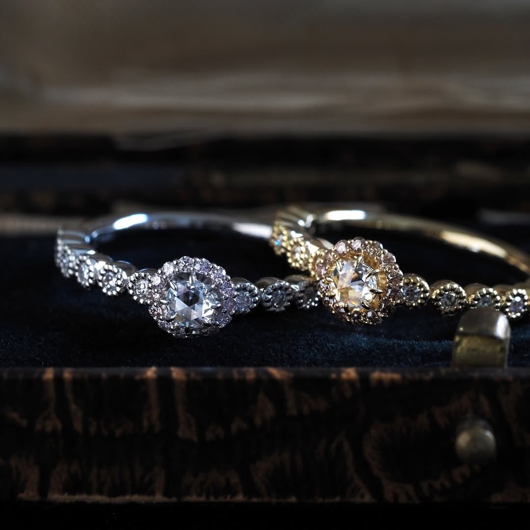 中心のマーキースを取り囲むのは、繊細なミルグレインと細やかな彫り留め。小さな宝石箱のように、胸元や指先で光をはじきます。石座の高さ、地金の厚み、側面の透かし──いずれも快適な着け心地と強度を両立させるために設計。爪は目立たないように仕立て、透かしは光を最大限に引き込みながらも、正面からは見えない軽やかさを添えています。
