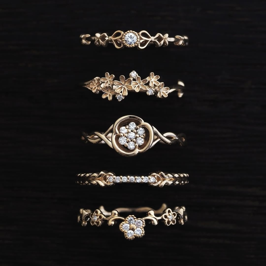 伝統のミル打ちを受け継ぎ、K9の温かみある色味と繊細な装飾で現代に昇華させたシリーズ。唐草やリボンなど多彩なデザインが揃い、重ねづけでクラシカルな華やぎを楽しめます。