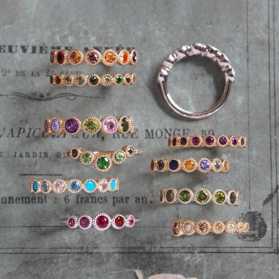 色彩豊かな宝石を、熟練の職人が極小の爪で隙間なく敷き詰めるパヴェセッティングにより、指先にきらめく表情が角度によって変化します。