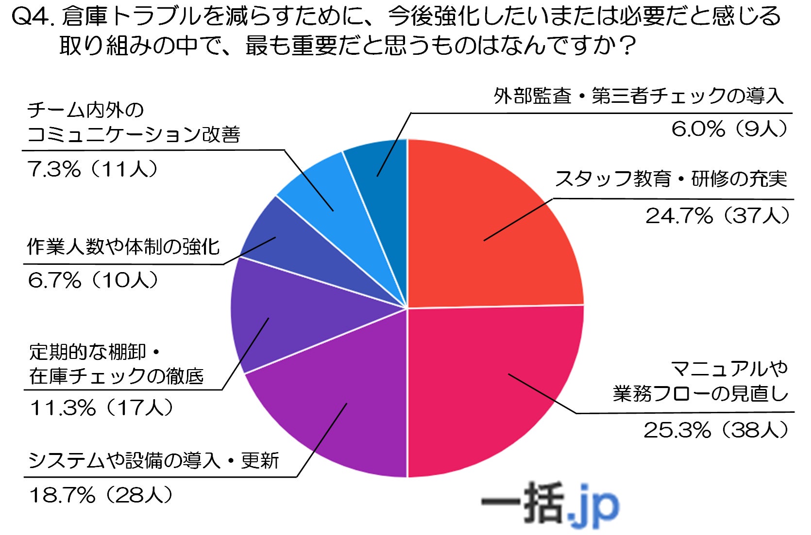 さらに「システムや設備の導入・更新」(18.7%、28人)や「定期的な棚卸・在庫チェックの徹底」(11.3%、17人)も一定の支持を集めており、IT活用や在庫管理の精度向上への関心もうかがえます。