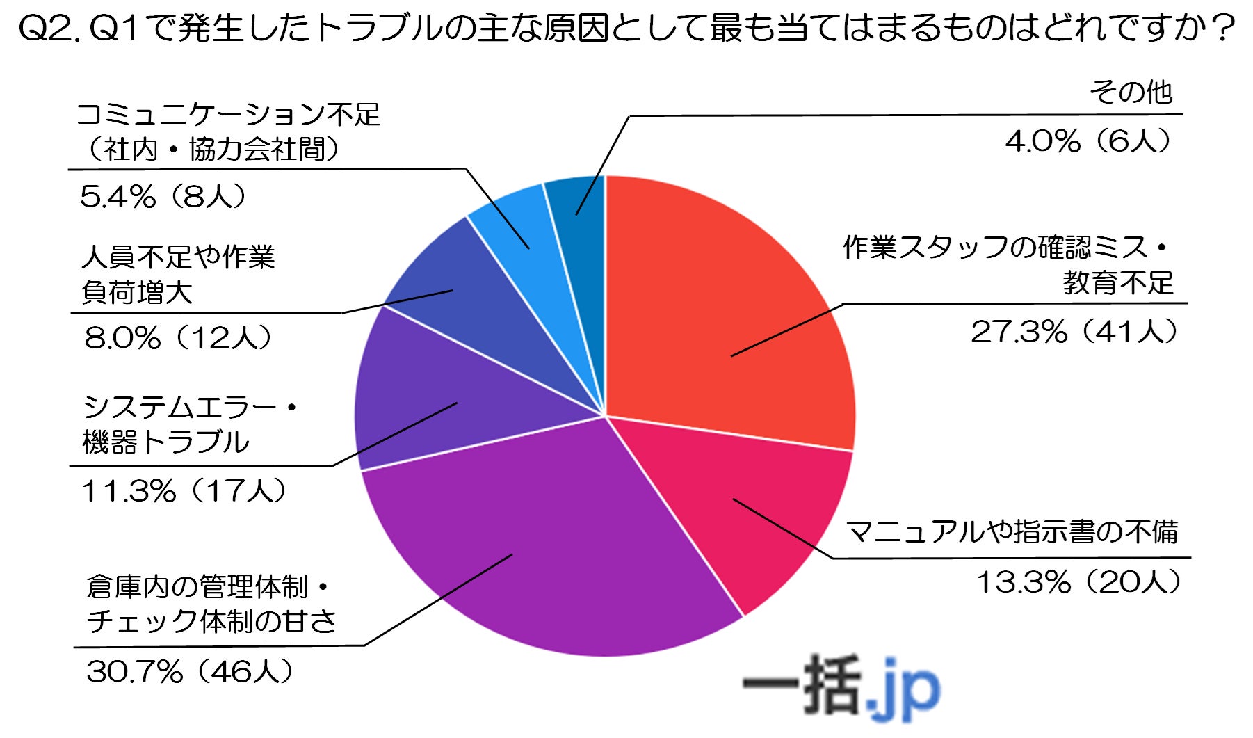 最も多かったのは「倉庫内の管理体制・チェック体制の甘さ」で、30.7%(46人)が選択しています。管理・チェック体制の不備がトラブルの根本的な原因となっているケースが多く、現場のルールや監督体制の強化が重要課題となっていることがうかがえます。
