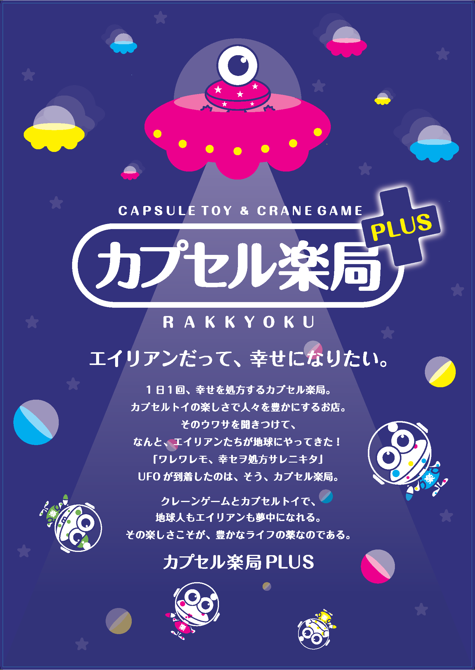 仕事や学校、買い物の帰りに、ふらっと立ち寄ってカプセルトイを手にする楽しさをお客さまに届け、元気を与えられるお店にしたいという思いから、カプセルトイの“カプセル”と薬の“カプセル”をかけたカプセルトイ専門店が『カプセル楽局』です。