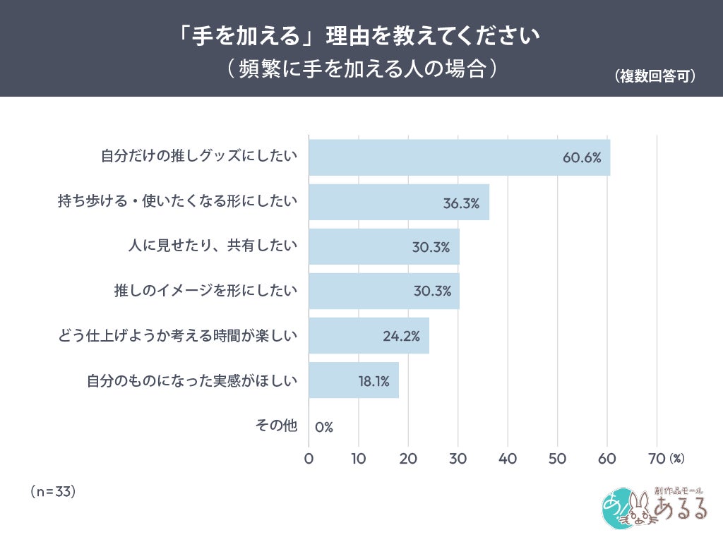 今回の調査の結果から、頻繁に手を加える人、たまに手を加える人のいずれでも、手を加える人のほとんどが「自分だけの推しグッズにしたい」という動機の共通点があることがわかりました。