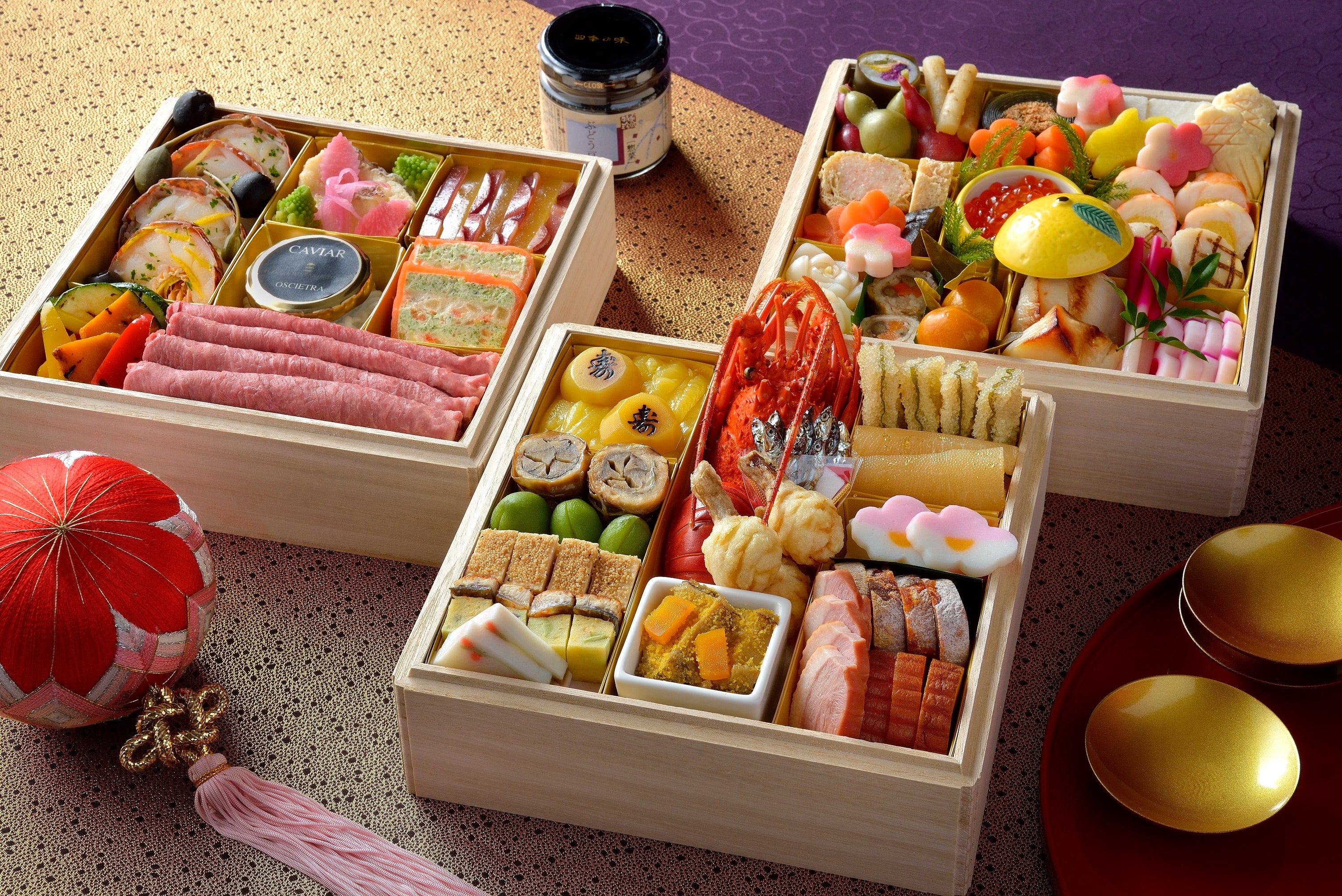 長寿伊勢海老、オシェトラキャビア、ずわい蟹海鼠腸和え、絵馬薩摩芋檸檬甘露煮、柚子釜入りいくら醤油漬け、伊達巻アカシア蜂蜜焼き、子孫繁栄数の子福美漬け、鱈場蟹奉書巻き、河豚の龍皮巻き、渋皮栗の百合根金団、御多福豆、酢取り牛蒡白胡麻風味、自家製唐墨、諸子甘露煮、冬茹椎茸萬年煮、新春寒筍、帆立貝たまり醤油山椒煮、京鴨ロース煮、スモークサーモン、越前塩うに、黒毛和牛蒸し焼き、紅白丁呂木、結びのし梅