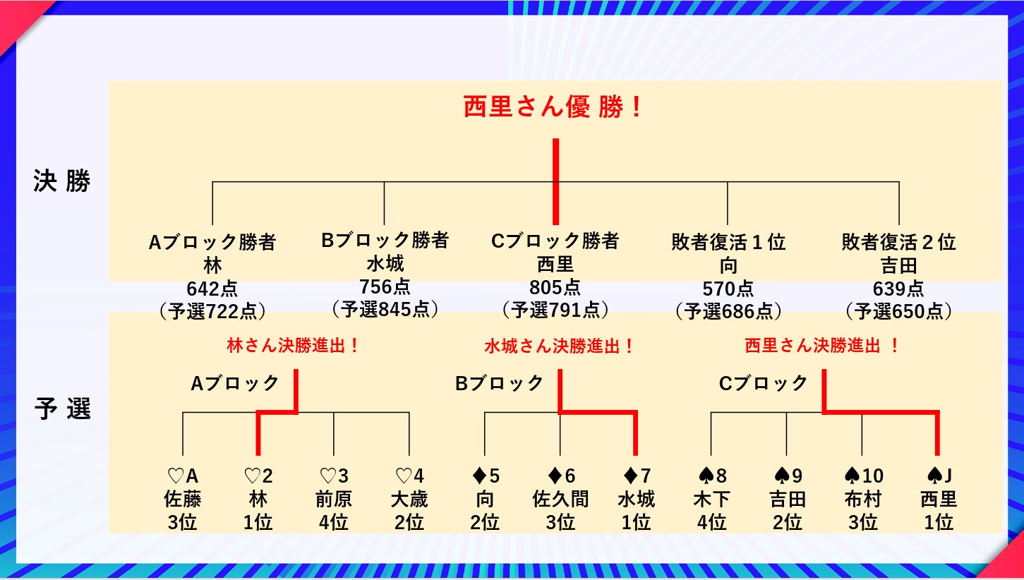 Aブロック・Bブロック・Cブロックで行われた予選。各ブロックの1位と、敗者復活枠から、以下の5名が決勝へと駒を進めました。