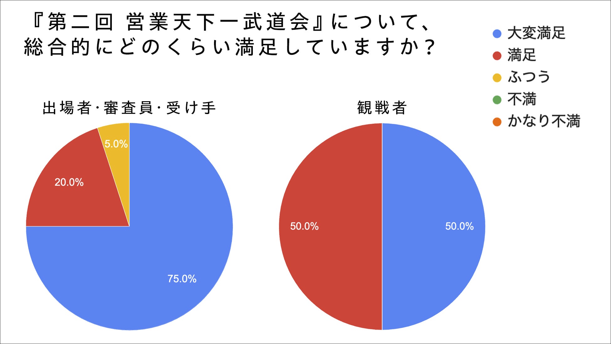 大会後、出場者や審査員、観戦者の皆様にアンケートを行いました。その結果、以下のように高い満足度を得られたことがわかりました。