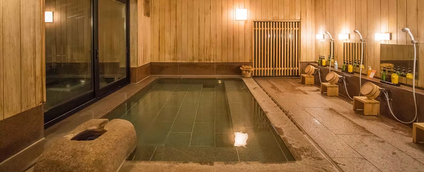 大浴場の浴室の天井・壁は青森産のヒバ材を使用しており木の香りを楽しみながらの入浴が楽しめます。浴槽は男湯は赤みかげ石、女湯は十和田石を用いています。