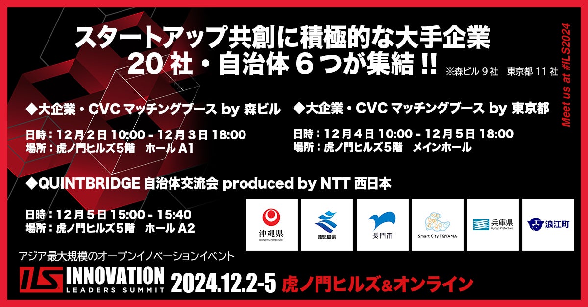 前回、20,000名強が参加したアジア最大のオープンイノベーションの祭典「イノベーションリーダーズサミット2024(略称:ILS2024) 運営:株式会社プロジェクトニッポン 後援:経済産業省」は、12月2日(月)-12月5日(木)に虎ノ門ヒルズ(東京)にて開催します(一部オンライン同時配信)。