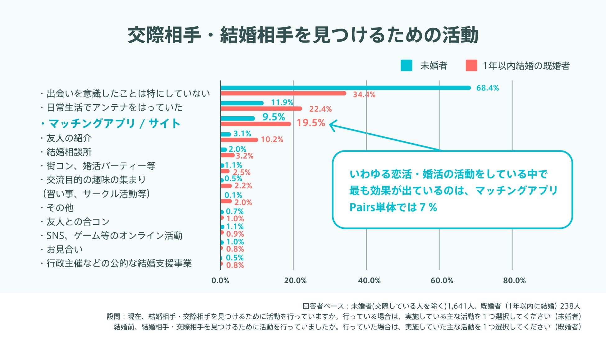 1年以内に結婚した人のきっかけPairs7%、マッチングアプリ全体で19%に