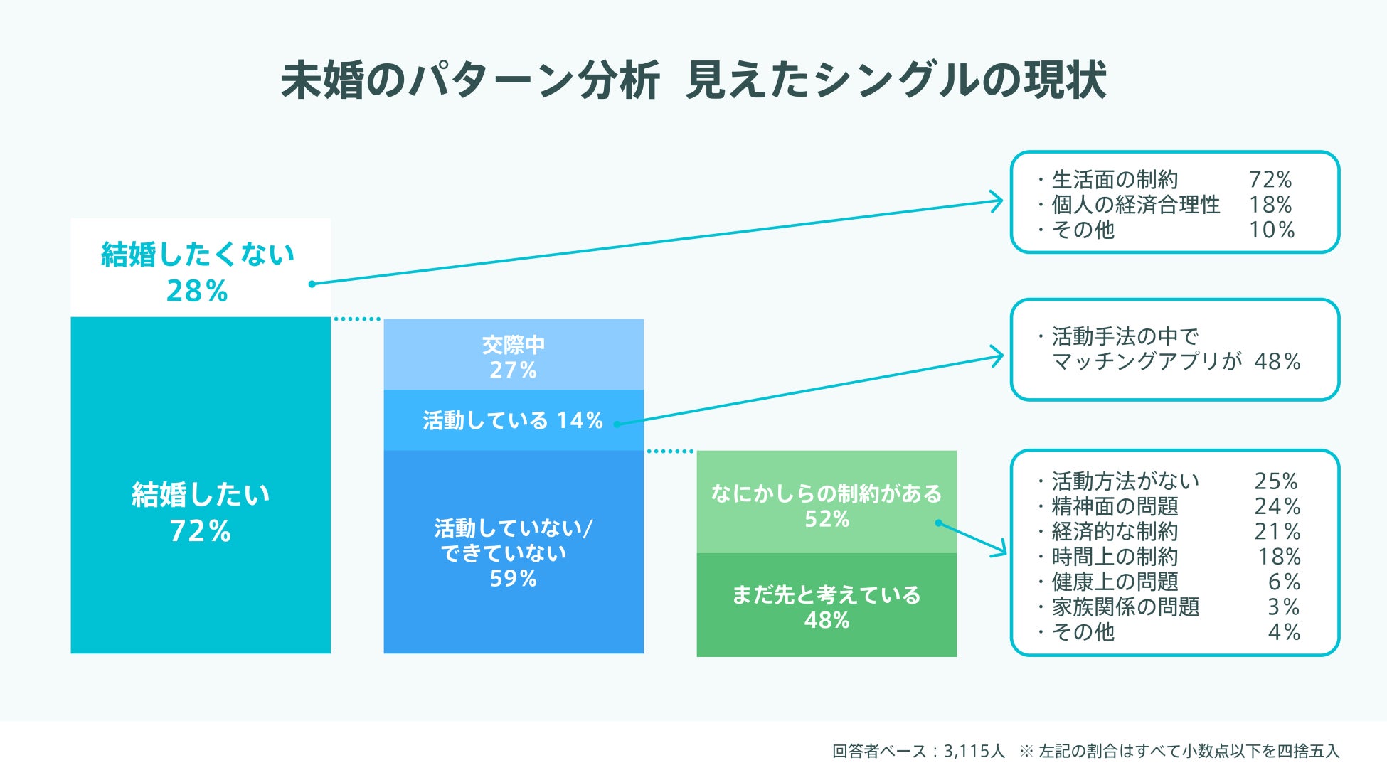 一方、未婚者全体を対象に、実態を詳細に聞き取り、整理した未婚パターンの分析(図2)では、未婚者の28%がそもそも「結婚したくない」と回答しており、経済的理由より生活面での制約を理由にあげる割合が高く、一人でいる・過ごすことに対する忌避感や抵抗感のようなものが薄れている傾向が伺えました。一方、結婚意思のある72%のうち「交際中」を除くと、59%と大半が「婚活をしていない・できていない」と回答しており、結婚意思があるのに活動できていない層への活動機会の提供が課題として浮き彫りとなりました。なお結婚意思があって「活動している人」は14%と少ないものの、その活動の種類ではマッチングアプリが48%と多くを占めていました。