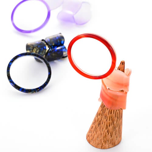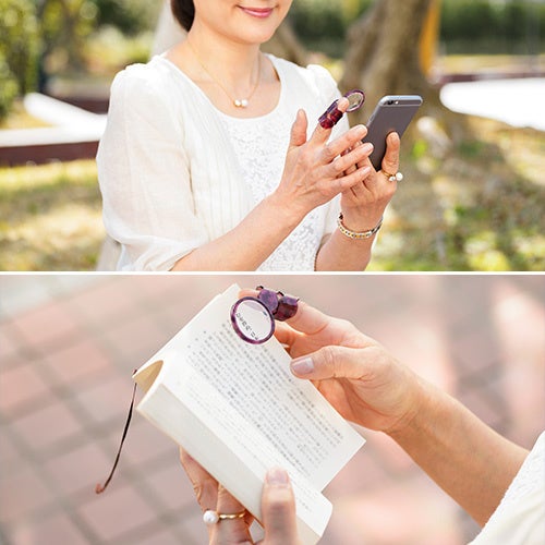 一度使うと手放せない、華やかで便利なシニアルーペ。使うときは、袋からさっと取り出し、指にスポッ。スマホを見たり、読書をしたり、また針に糸を通す時など、細かな作業をする時にも重宝する。セルロースアセテートの9色のバリエーションからお好きな色をどうぞ。