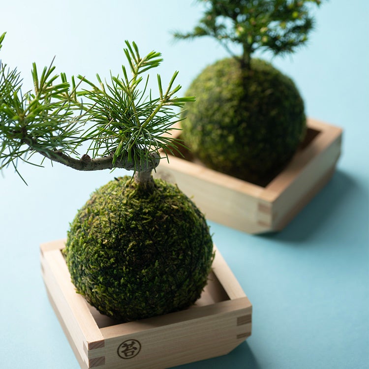 10cm四方の升にすっぽりと収まる苔玉と盆栽。日本文化が詰まったモダンでユニークなデザインは、グッドデザイン賞を受賞するなど高く評価されている。“癒やし”のほっこりプレゼントとして大人気のアイテム。
