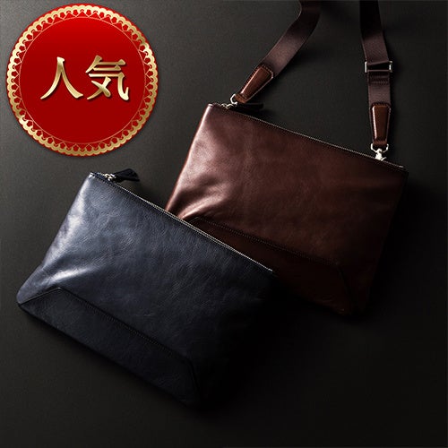 スリムで収納しやすい高級レザーサコッシュ。素材は北米産の原皮を国内有数の皮革産地である姫路のタンナーで鞣し、オイル加工を施したもの。レザーショルダーベルトは取り外し可能で、クラッチバッグやバッグインバッグとしても活躍。