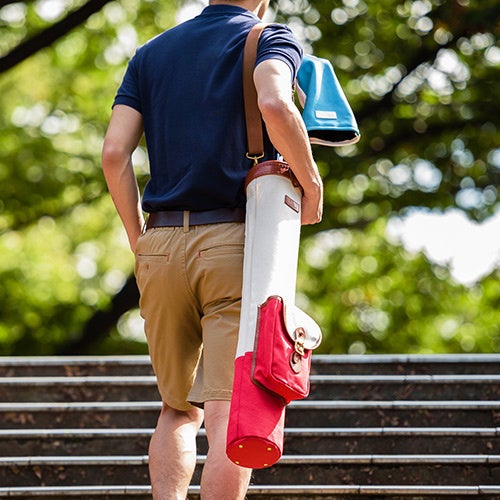 帆布素材と栃木レザーを組み合わせたゴルフクラブケース。数本持ち歩くために作られたこのケースはクラシックなモデルを掲げ、円筒形を肩掛けにするタイプで練習場やショートコースを回るに最適なサイズ。ゴルフが趣味の方へ気の利いたプレゼントとしておすすめ。