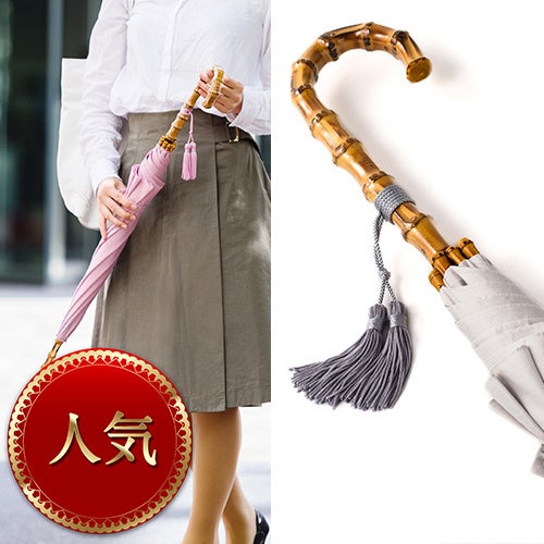 昭和13年創業の老舗傘工房で作られるメイドインジャパンの晴雨兼用傘。天然竹のハンドル、綿ピケの生地、ボリューム感のあるタッセルなど、その上品なたたずまいで多くのファンに愛される。一目で高級と分かり、女性の気品を醸し出すアイテムとしてギフトにも人気。