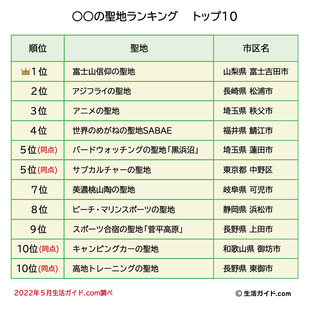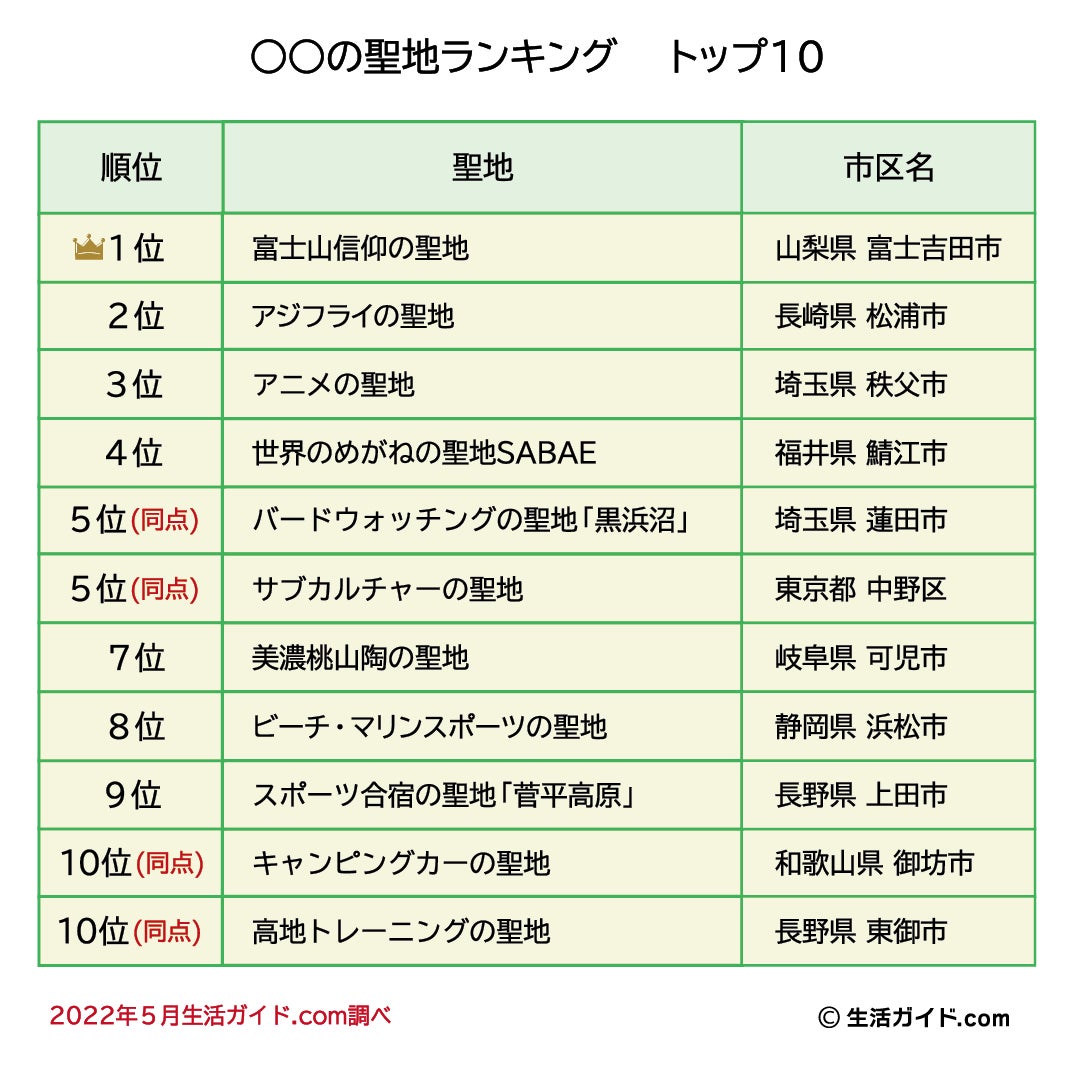 株式会社ウェイブダッシュ(本社:東京都千代田区、代表取締役社長 河野 由紀)が運営する、みんなでつくる地域応援サイト「生活ガイド.com」(https://www.seikatsu-guide.com/) は、みんなのランキング第36回「○○の聖地ランキング」のトップ10を発表いたしました。
