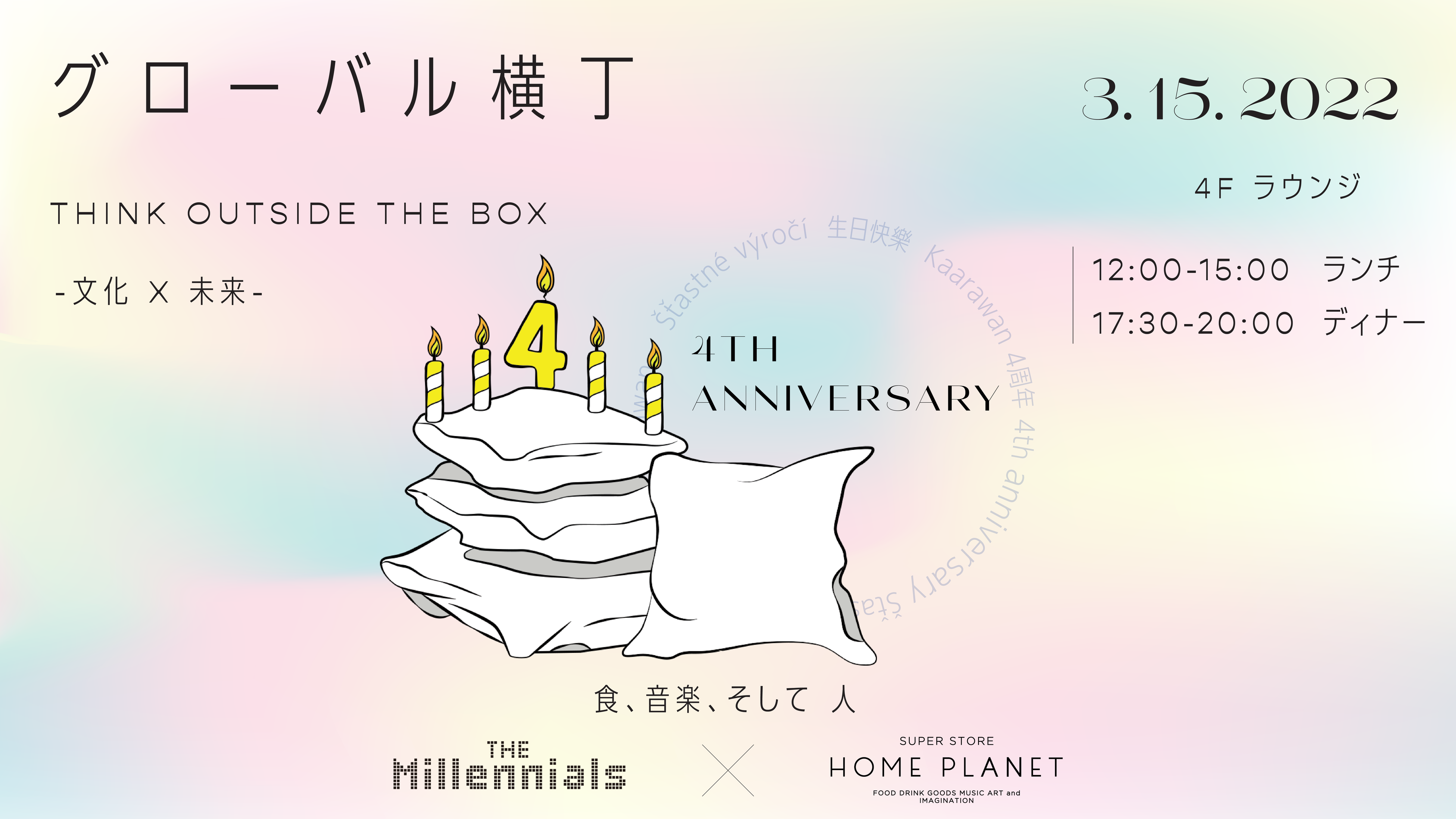 ミレニアル世代向けに特化したライフスタイルホテル「The Millennials 渋谷」は、「The Millennials」ブランドとしては京都に続く2号店として2018年3月15日にオープンしました。4周年を迎える今年は、コンセプトである“未来が見える 宿泊体験”にフォーカスをあてて、「The Millennials」で体験する食や音楽、そして人との関わりを通じて、お客様が自分自身をアップデートできる場として、イベント“グローバル横丁 Think out of the box / Culture×Future”を企画しました。 今回は“未来を想像し味わう”をテーマに、吉祥寺の SUPER STORE「HOME PLANET」とのコラボレーションにより、「The Millennials 渋谷」外国籍スタッフの母国の味をオリジナルレシピでご用意しました。世界の“食”を楽しんだり、外国籍スタッフとの交流や DJ による生の音楽に触れて、新しいホテルの過ごし方を体験してみませんか。
