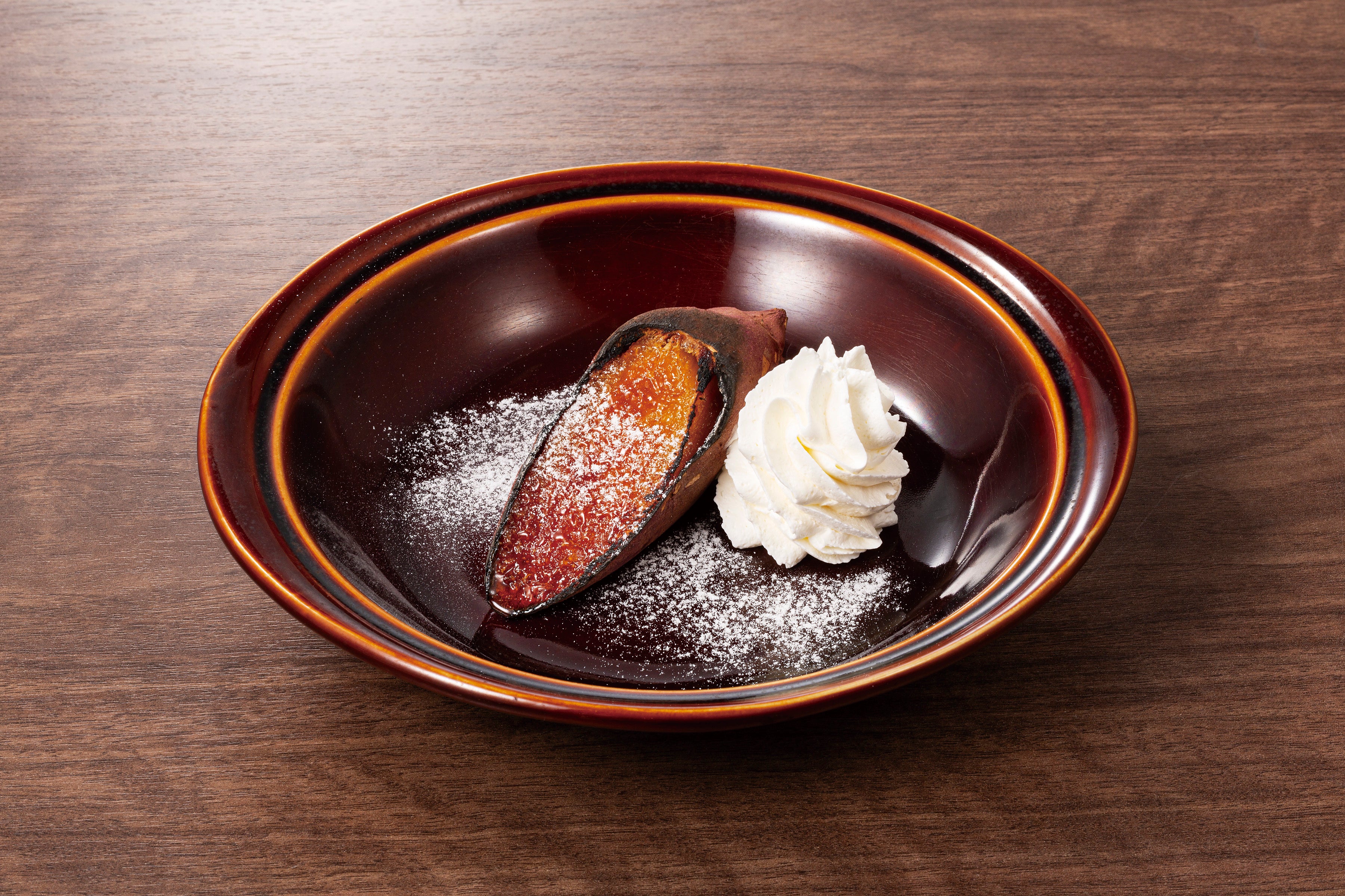 表面はカリッ、中はしっとり! 食感のコントラストも楽しい、ブリュレ仕立ての一皿。茨城県産「紅天使」の焼きいもは、定温貯蔵して甘味を引き出したさつまいもをじっくりと焼き上げているので、ねっとりとした甘さを楽しめます。そのまま食べてもまるでスイーツのような焼きいもに、ひと手間を加えることで華やかさをアップしました。素材の魅力を最大限に引き出した、シンプルながら味わい深いデザートをぜひお楽しみください。
