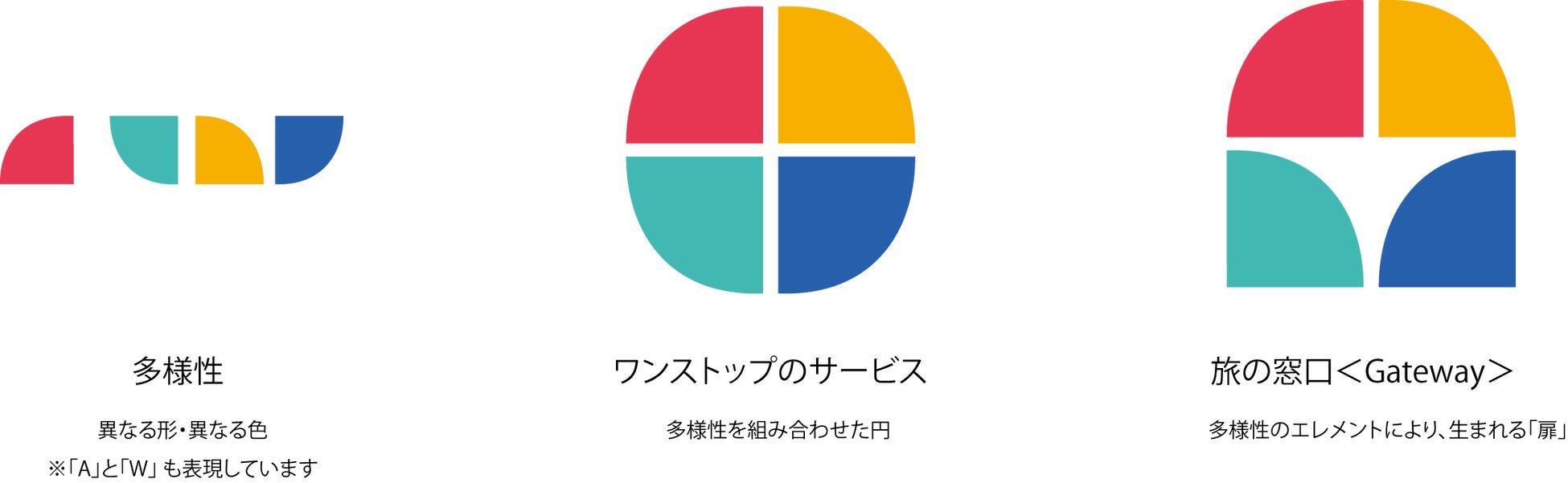 ①ミッション「旅する人と、それを支えるすべての人が一歩先の未来へ踏み出す後押しをします」を表すため、四分円を未来へとつながるドアに見立てている。