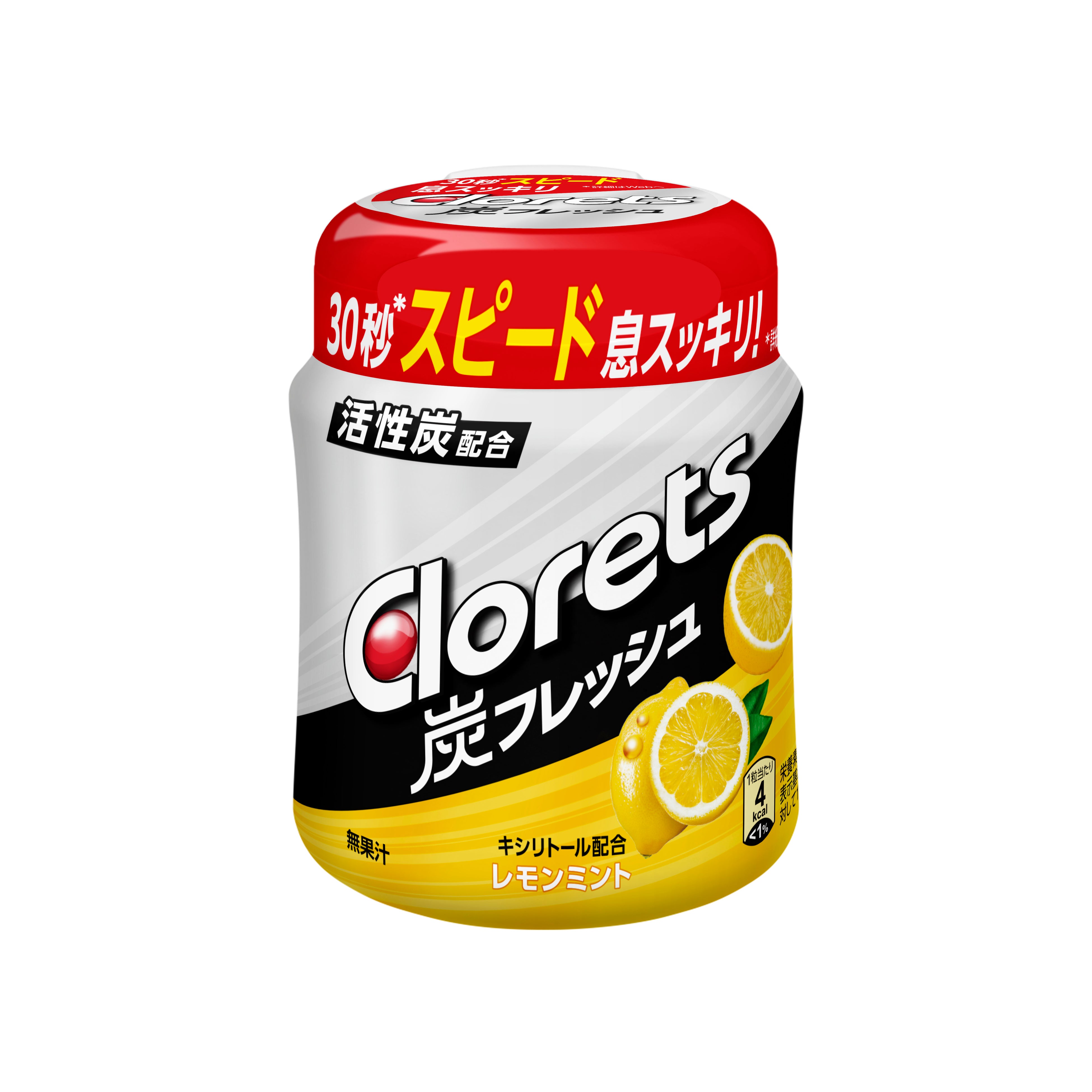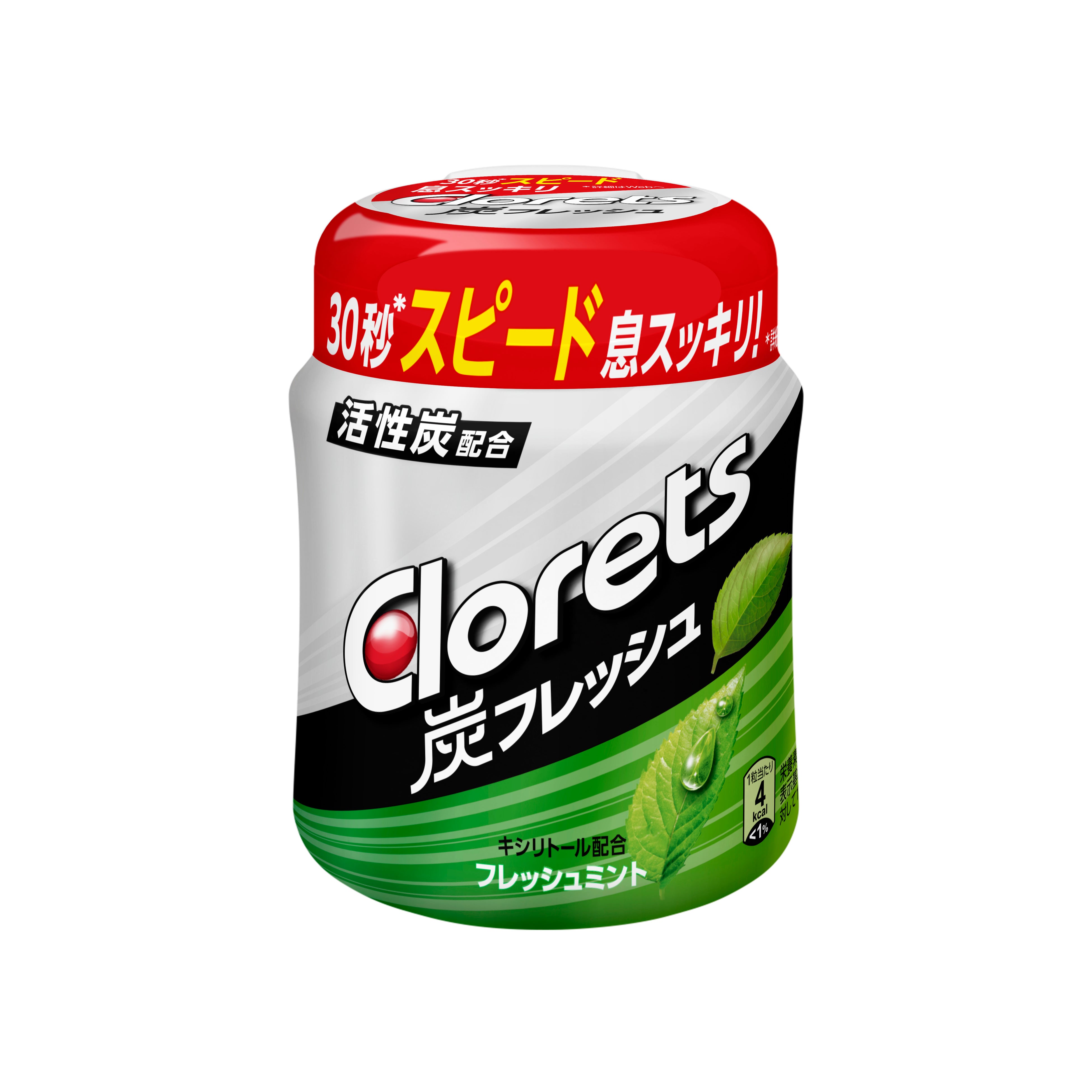 無味無臭の活性炭を配合した大粒ガムが特徴のボトルタイプ。上部に赤色をバックにした“30秒*スピード息スッキリ!”の文字を入れることで、「炭フレッシュ」の特長を分かりやすくリニューアルデザインしました。ボトル本体には、黒の差し色を効かせ、「炭」感を演出しています。