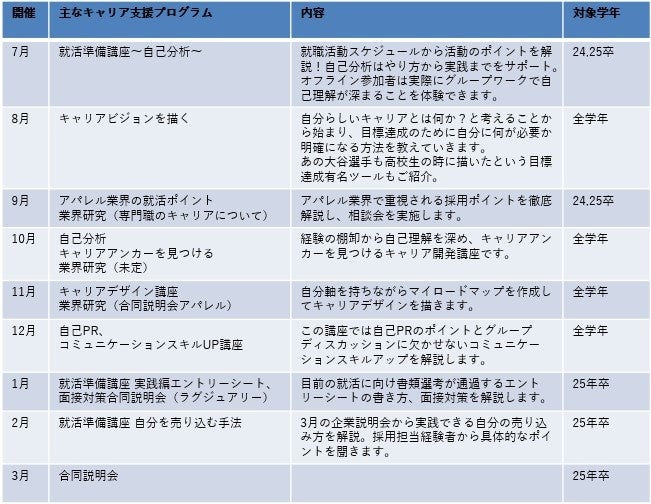 このキャリア支援プログラムでは、文化服装学院ファッション流通高度専門士科にてキャリア開発の授業を担当するiDAのキャリアコンサルタントが、業界ならではの就活ノウハウ、入社後も活躍できる能力開発などの講義を行います。一人ひとりのキャリアビジョンを明確化し、自分軸を持って主体的に就職活動や卒業後の進路決定ができること、そして、充実した豊かな人生を歩めるよう支援することを目的としています。