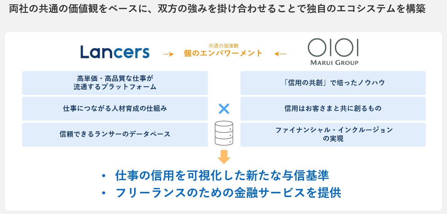 フリーランス向けのサービスを展開し蓄積されたデータベースやノウハウを持つランサーズの強みと、小売・フィンテック・未来投資の三位一体でビジネスを展開している丸井グループの強みを掛け合わせ、フリーランス向け金融サービスの開発・提供に向けた共創を開始いたします。