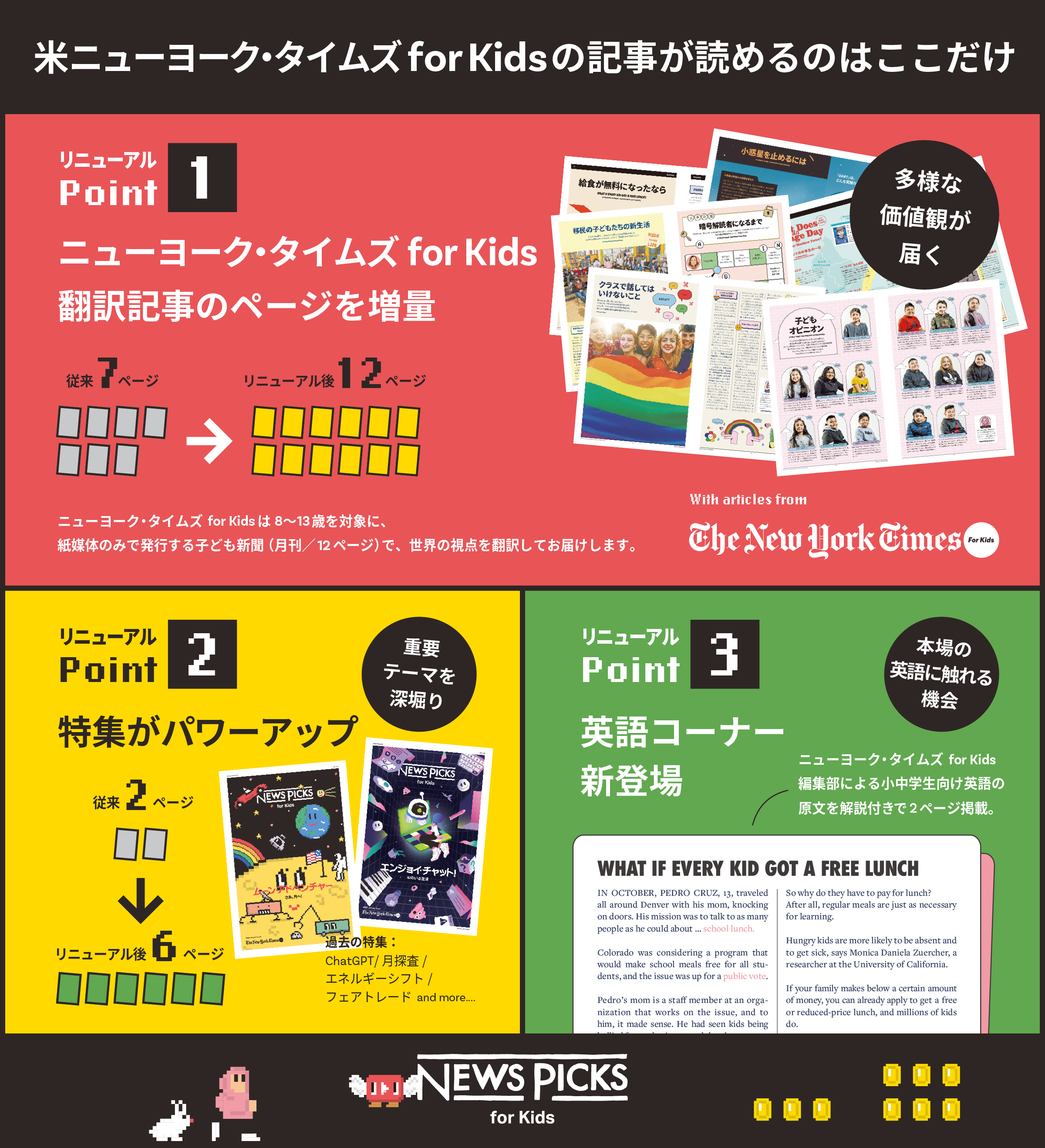・英語コーナー新設:ニューヨーク・タイムズ For Kids 編集部による小中学生向けの英語原文コーナーを、専門家の解説付きで新たに2ページ掲載
