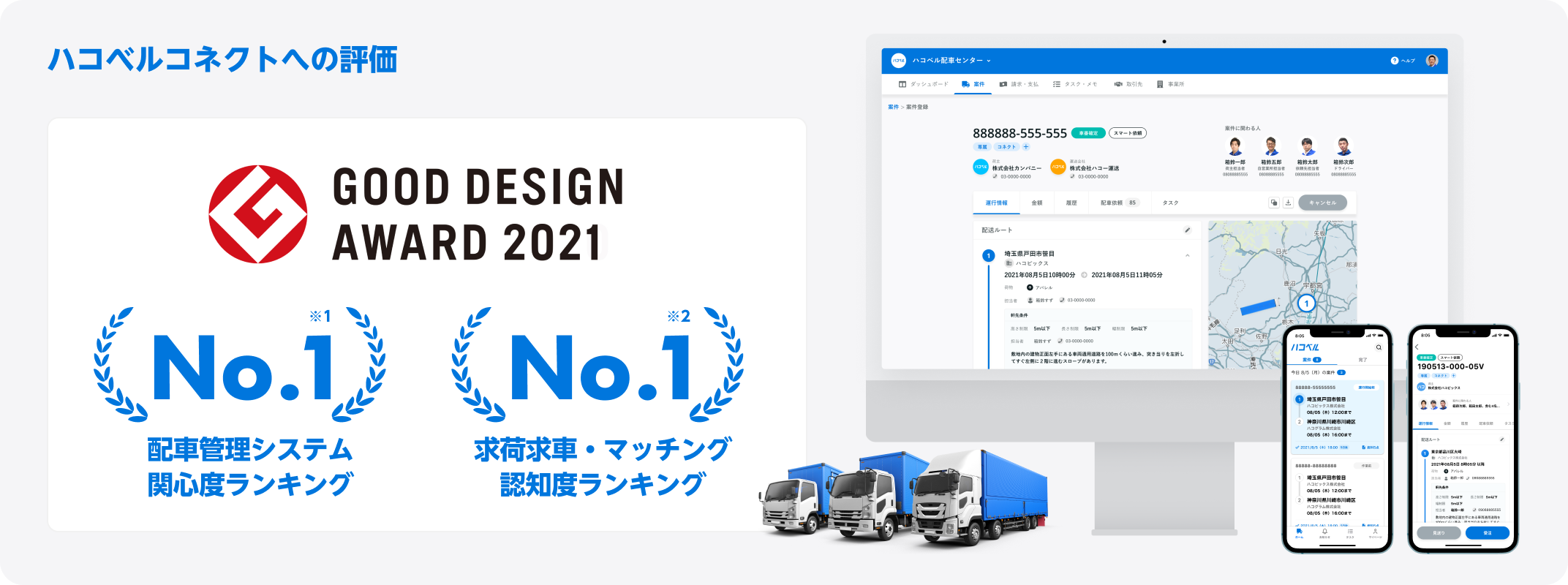 2021年には、国内最大の物流ニュースサイト「LOGISTICS TODAY」が実施した「配車計画システム関心度ランキングTOP40」(2021年7月実施)、「求荷求車・マッチング認知度ランキング」(2021年10月実施)で連続してNo.1を獲得し2冠を達成、また2021年度グッドデザイン賞(主催:公益財団法人日本デザイン振興会)を受賞するなど、サービス実績拡大とともに業界内外でもご評価をいただいております。